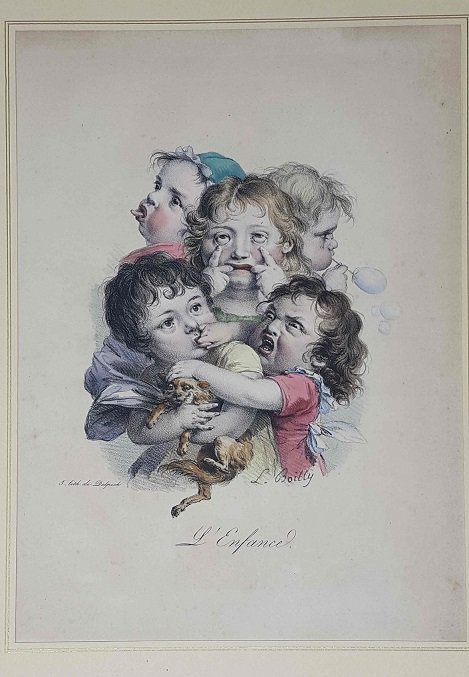 >Litografia originale a colori. Caricatura di 5 volti di bambini intenti a fare smorfie ed insolite espressioni facciali. Tratta dalla serie "Les Grimaces". Titolo in basso al centro, firmata a destra in litografia "L. Boilly", a sinistra "J. lith de Delpech".