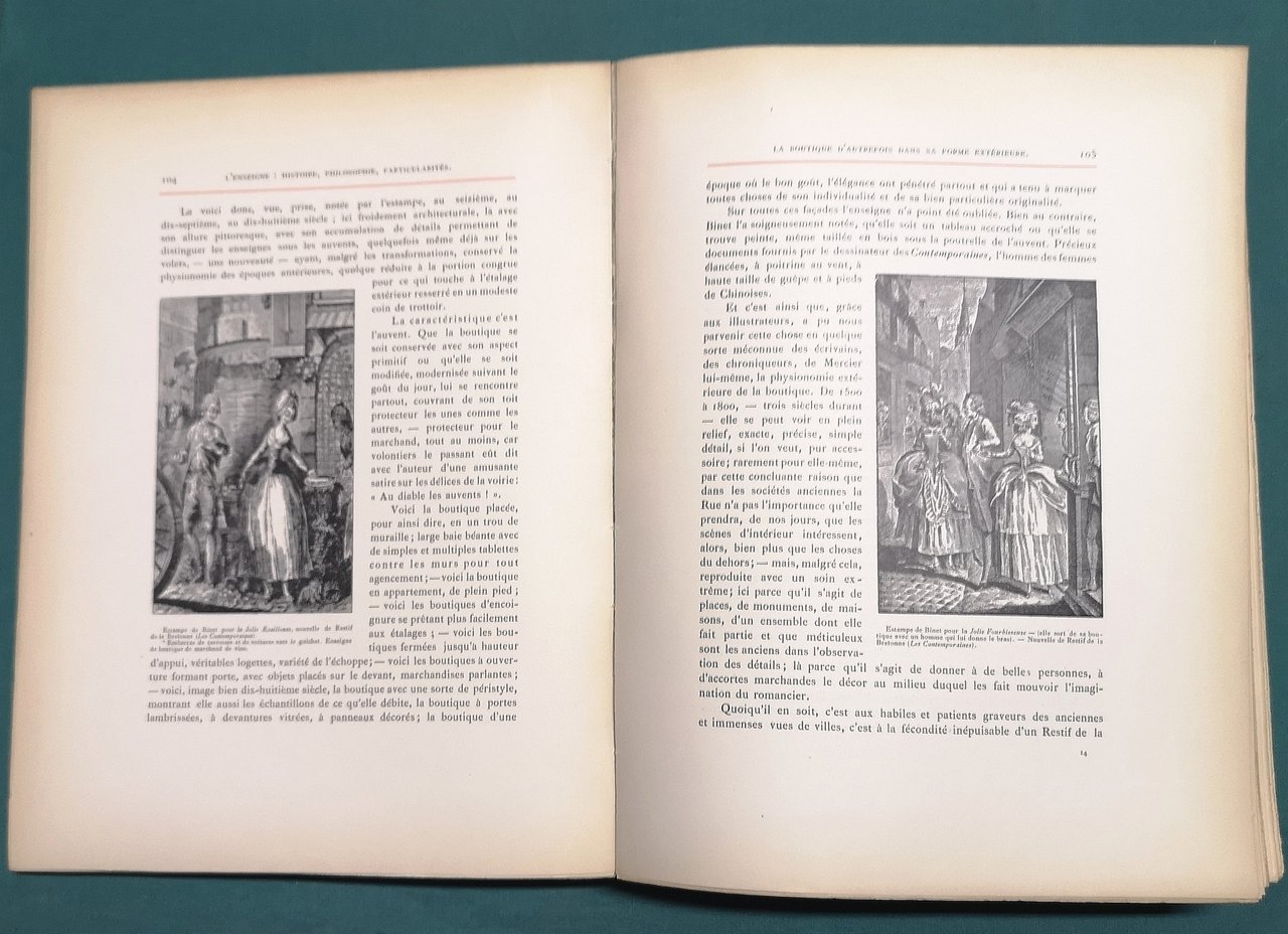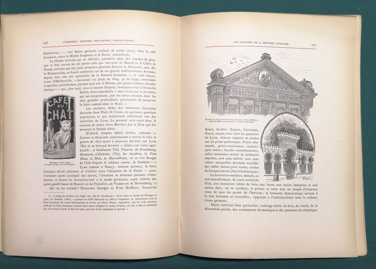 >in-4, pp. (10), XXVIII, 466 con centinaia di illustrazioni in bianco e nero e a colori, e diverse tavole a colori a piena pagina. Leg. in cart. editoriale figurato a colori (piccoli usuali difetti alla coperta). Edizione originale, tirata in 1250 esemplari numerati (ns. 647), di questo straordinario studio sulle insegne pubblicitarie corredato da imponente apparato iconografico, con la riproduzione di antiche stampe e i disegni di B.J. Gustave Garnier detto Girrane. Esemplare internamente perfetto, a fogli chiusi.