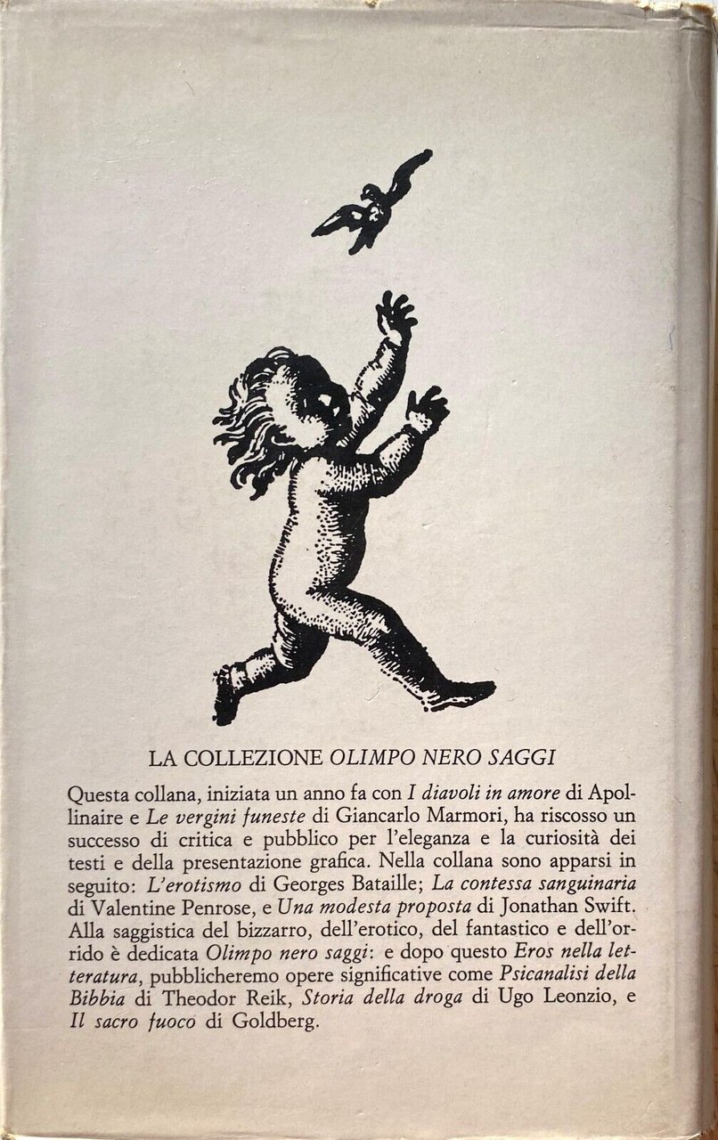 - LA COLLEZIONE OLIMPO NERO SAGGI. Questa collana, iniziata un anno fa con I diavoli in amore di Apollinaire e Le vergini funeste di Giancarlo Marmori, ha riscosso un successo di critica e pubblico per l'eleganza e la curiosità dei testi e della presentazione grafica. Nella collana sono apparsi in seguito: L'erotismo di Georges Bataille; La contessa sanguinaria di Valentine Penrose, e Una modesta proposta di Jonathan Swift. Alla saggistica del bizzarro, dell'erotico, del fantastico e dell'orrido è dedicata Olimpo nero saggi: e dopo questo Eros nella letteratura, pubblicheremo opere significative come Psicanalisi della Bibbia di Theodor Reik, Storia della droga di Ugo Leonzio, e Il sacro fuoco di Goldberg.