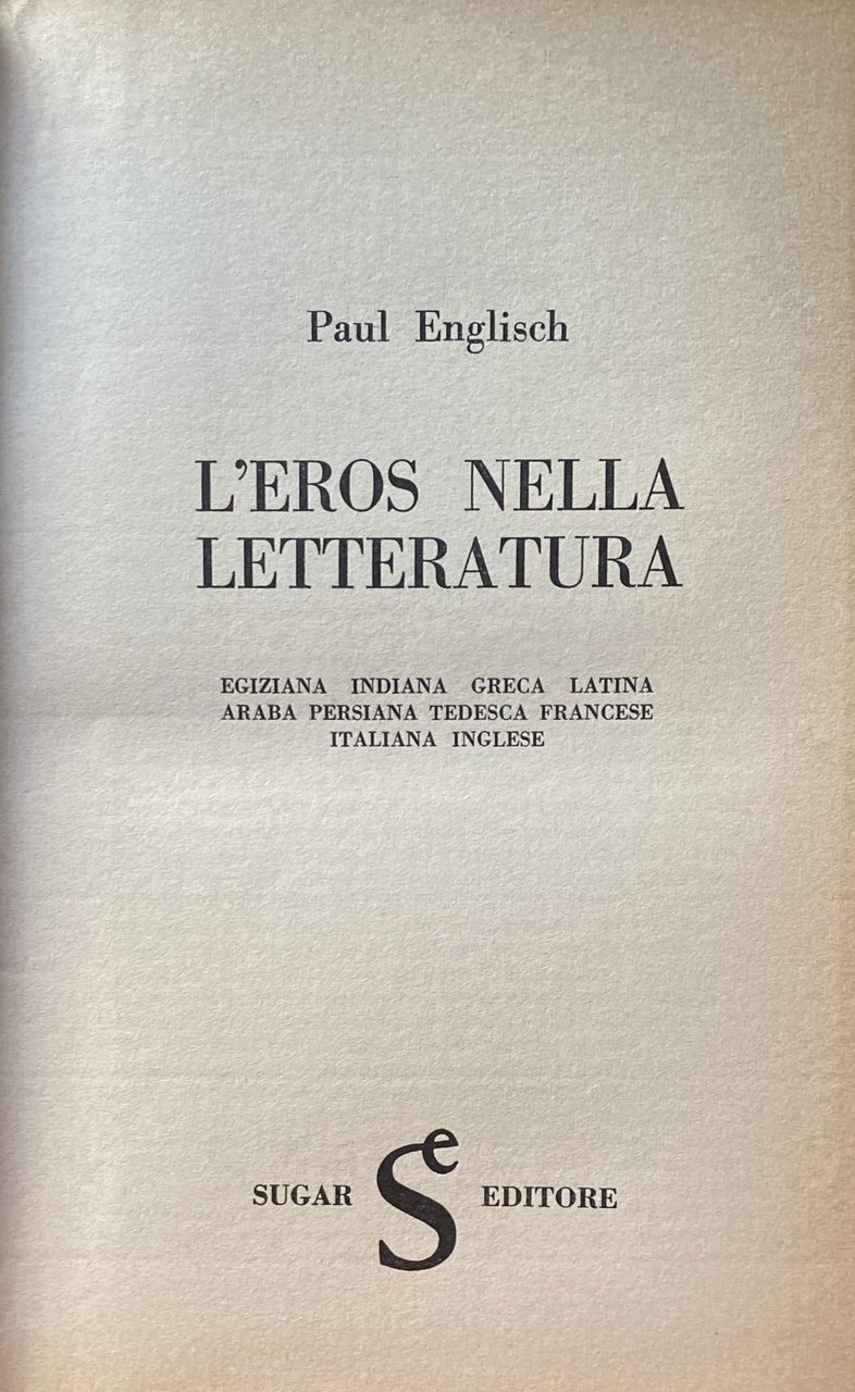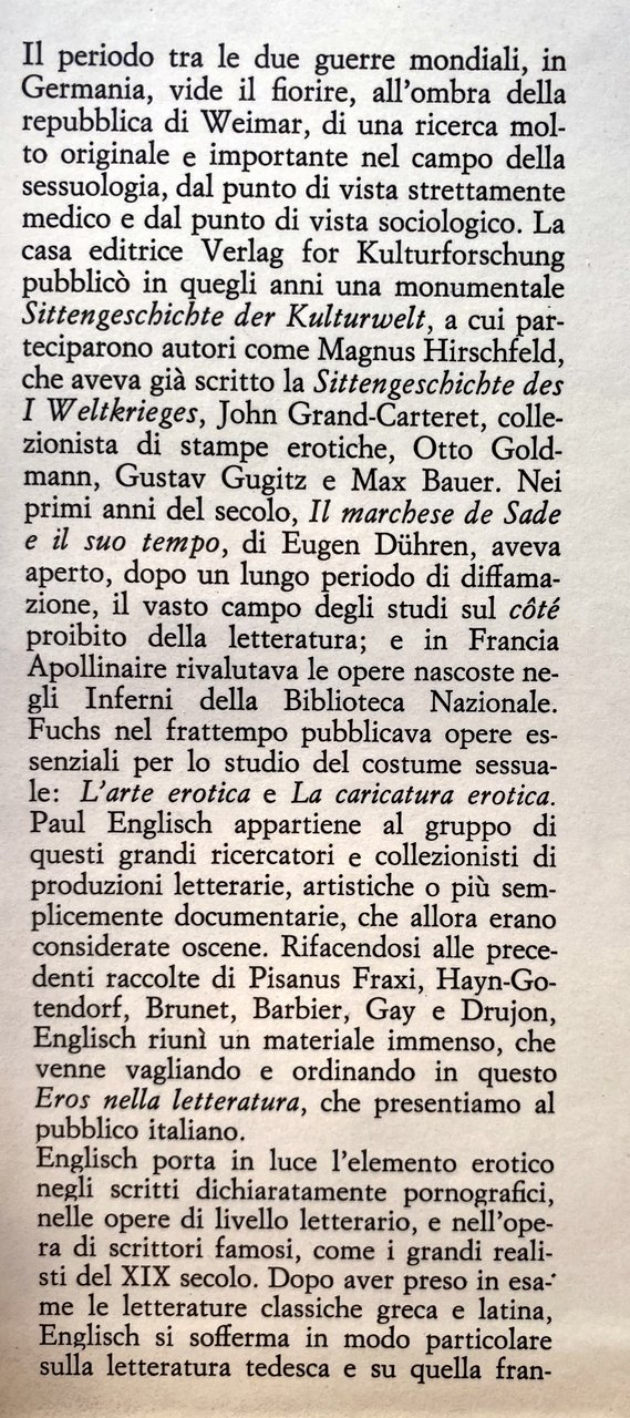 Il periodo tra le due guerre mondiali, in Germania, vide il fiorire, all'ombra della repubblica di Weimar, di una ricerca molto originale e importante nel campo della sessuologia. La casa editrice Verlag for Kulturforschung pubblicò una monumentale Sittengeschichte der Kulturwelt, a cui parteciparono autori come Magnus Hirschfeld, (Sittengeschichte des I Weltkrieges), John Grand-Carteret, collezionista di stampe erotiche, Otto Goldmann, Gustav Gugitz, Max Bauer. Il marchese de Sade e il suo tempo, di Eugen Dühren, aveva aperto, dopo un lungo periodo di diffamazione, il vasto campo degli studi sul côté proibito della letteratura; e in Francia Apollinaire rivalutava le opere nascoste negli Inferni della Biblioteca Nazionale. Fuchs nel frattempo pubblicava opere essenziali per lo studio del costume sessuale: L'arte erotica e La caricatura erotica. Paul Englisch era uno dei grandi ricercatori e collezionisti di produzioni letterarie, artistiche o documentarie, che allora erano considerate oscene. Rifacendosi alle precedenti raccolte di Pisanus Fraxi, Hayn-Gotendorf, Brunet, Barbier, Gay e Drujon, E. riunì un materiale immenso, che venne vagliando e ordinando in questo Eros nella letteratura. E. porta in luce l'elemento erotico negli scritti dichiaratamente pornografici, nelle opere di livello letterario, e nell'opera di scrittori famosi, come i grandi realisti del XIX secolo. Dopo aver preso in esame le letterature classiche greca e latina, si sofferma sulla letteratura tedesca e francese. Una parte del libro è dedicata alla letteratura erotica inglese e a quella italiana, fino alla Controriforma. Nell'appendice, un excursus rapido e denso di dati sulle letterature araba, egiziana, indiana. Quest'opera offre il più completo panorama dell'Eros nella letteratura dalla antichità classica all'inizio del XX secolo.