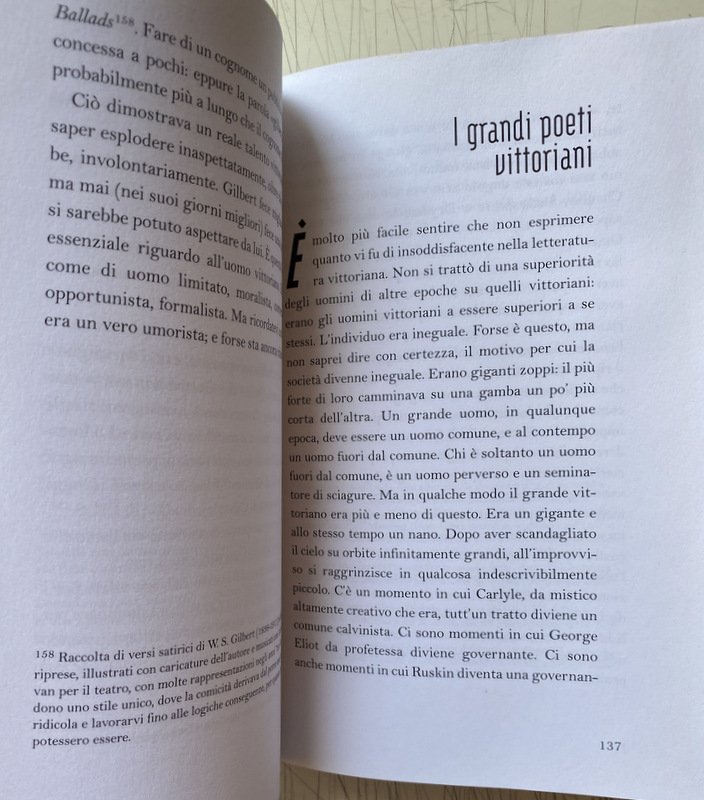 Soggetti: Letteratura inglese, Ritratti, Biografie, Bentham, Thomas Carlyle, Charles Dickens, Thomas Hardy, George Eliot, Alfred Tennyson, Jane Austen, Robert Browning, Thomas Babington Macaulay, Algernon Charles Swinburne, Robert Louis Stevenson, Infanzia, Mondo vittoriano, Storia, Critica letteraria, Narrativa, Romanzieri, Scrittori Vittoriani, Prosa, XIX secolo, Compromesso vittoriano, Utilitarismo mercantile, Ricchezza, Prestigio sociale, Estetismo, Imperialismo, Bibbia, Colonialismo, Ottocento, Lavoro, Impero Britannico coloniale, Prosperità, San Giorgio, Eccentrici, Pensiero, Tradizione, Classici, Progressismo, Progressisti, Wuthering Heights, Cime tempestose, Romanzi, Romanzo storico, Jonathan Keates, Socialismo utopico, Progresso, Masolino D'Amico, Humour, Common sense, Commercio estero, Pace, Povertà, Capitalismo, Armamenti, Grande Guerra, Londra, Inghilterra, Consultazione, Riferimento, Libri Vintage fuori catalogo, Recensioni, Opere generali, Viaggio, Selvaggi, Pedagogia, Etica, Poesia, Poetica, Estetica, Il mulino sulla Floss, William Blackwood, Henry James, Most successful, Bestsellers, Capolavori, Mary Ann Evans, Scene di vita clericale, Codici morali, More uxorio, George Henry Lewes, Regina Vittoria, Fedeltà, Famiglia, Sentimento, Scandalo, Felicità, Donna, Donne, Esteta, Aristocratici, Bernard Shaw, Elizabeth Browning, Anthony Burgess, Lord Byron, Secolo cattolico, Charlotte Brontë, Cristiana, Chiesa, William Cobbett, Coventry Patmore, Democrazia, Eccentrico, Emily Brontë, Europea, Combattere, Rivoluzione francese, Genio, Aldous Huxley, Kingsley, Rudyard Kipling, Matthew Arnold, Max, Beerbohm, Meschinità, Moderna, Natura, Morale, Newman, Movimento, Oxford, Pagano, Pendennis, Filosofia, Poesia, Politica, Religione, Puritanesimo, Puritani, Rivoluzionari, Romanticismo, Dante Gabriel Rossetti, Scettici, Ruskin, Percy Bysshe Shelley, Stile, Tennyson, Thackeray, Victor Hirtzler, Spirito vittoriano, Whigs, Tory, Oscar Wilde, Storia letteraria, Meredith, Classe media, Ricchezza, Ortodossia, Relativismo etico, Benessere, Vacuità, Criticismo, Saggi critici, Daily News, Speaker, Pruderie, Razionalismo, Falsità, Bibbia, Dio, Froude, Sartor Resartus, Manchester, Past and Present, Stuart Mill, Malthus, Lord Ciambellano, Cromwell, Irlanda, Francis Thompson, Scozia, Disraeli, John Brown, Ballate, George Macdonald, Lewis Carroll, Nonsense, Charles Keene, Umorismo, C.S. Calverley, J.K. Stephen, Parodie, John Bull, Hardy, John Inglesant, Dandysmo, Paul Clifford, Grandi Speranze, Great Expectations, Coming Race, Kenelm Chillingly, Fantascienza, Fantasy, The Book of Snobs, Snobismo, Vanity Fair, Newcomes, Kew, Our mutual friend, Juliana Ewing, Charlotte Mary Yonge, Yorkshire, Mary Augusta Ward, Industria, Maschilismo, Luddismo, Shirley, Africa, Olive Schreiner, Glenallan, Gotico, Walter Scott, L'Antiquario, Gusto, Ragione, Convenevoli, David Copperfield, Enrico VIII, Idylls, Suspance, Antony Trollope, Wilkie Collins, Natale, Darwin, Decadenti, Dramatic lyrics, Andrea del Sarto, John Keats, Rivoluzione Industriale, Ottocento, Preraffaelliti, Le pietre di Venezia, Stones of Venice, Pickwick Papers, William Wordsworth, Samuel Taylor Coleridge, Tabù vittoriani, Censura, Disagi sociali, Hard Times, Hungry Forties, Anni quaranta, Fame, Corn Laws, Pierre-Joseph Proudhon, Biedermeier, Esposizione universale, Crystal Palace, India, White man's burden, Fardello dell'uomo bianco, Civilizzare, Africani, Indiani, Cuore di tenebra, Tess dei d'Urbervilles, Inconscio, Evoluzionismo, Stevenson, Lo strano caso del dr. Jekyll e mr. Hyde, The Time Machine, Herbert George Wells, Art for Art's sake, Il ritratto di Dorian Gray, Magia, Spiritismo, Nazionalismo, Patria, Valori morali, Mario Praz, Motore a vapore, English Literature, Portraits, Biographies, Childhood, Victorian World, History, Literary Criticism, Fiction, Novelists, Victorian Writers, Prose, 19th Century, Victorian Compromise, Merchant Utilitarianism, Wealth, Social Prestige, Aestheticism, Imperialism, Bible, Colonialism, 19th Century, Labour, British Empire Colonial, Prosperity, St George, Eccentrics, Thought, Tradition, Classics, Progressivism, Progressives, Wuthering Heights, Novels, Historical Fiction, Utopian Socialism, Progress, Foreign Trade, Peace, Poverty, Capitalism, Armaments, Great War, London, England, Reference, Reference, Out-of-print books, Reviews, General works, Travel, Wilds, Pedagogy, Ethics, Poetry, Poetics, Aesthetics, Mill on the Floss, Masterpieces, Scenes from Clerical Life, Moral Codes, Queen Victoria, Loyalty Family, Feelings, Scandal, Happiness, Woman, Women, Aesthete, Aristocrats, Catholic century, Christian, Church, Democracy, Eccentric, European, Combat, French revolution, Genius, Meanness, Nature, Movement, Pagan, Pendennis, Philosophy, Poetry, Politics, Puritanism, Puritans, Revolutionaries, Romanticism, Skeptics, Style, Victorian Spirit, Literary History, Middle Class, Wealth, Orthodoxy, Ethical Relativism, Welfare, Emptiness, Criticism, Critical Essays, Prudence, Rationalism, Falsehood, Bible, God, Lord Chamberlain, Ireland, Scotland, Ballads, Humor, Parodies, Sci-fi, Industry, Machismo, Luddism, Gothic, The Antiquarian, Taste, Reason, Pleasants, Henry VIII, Christmas, Decadent, Industrial Revolution, Nineteenth Century, Pre-Raphaelite, Taboo, Censorship, Social hardships, Universal Exposition, Civilize, Africans, Indians, Heart of Darkness, Unconscious, Evolutionism, The strange case, The Picture, Spiritualism, Nationalism, Fatherland, Moral values, Steam engine
