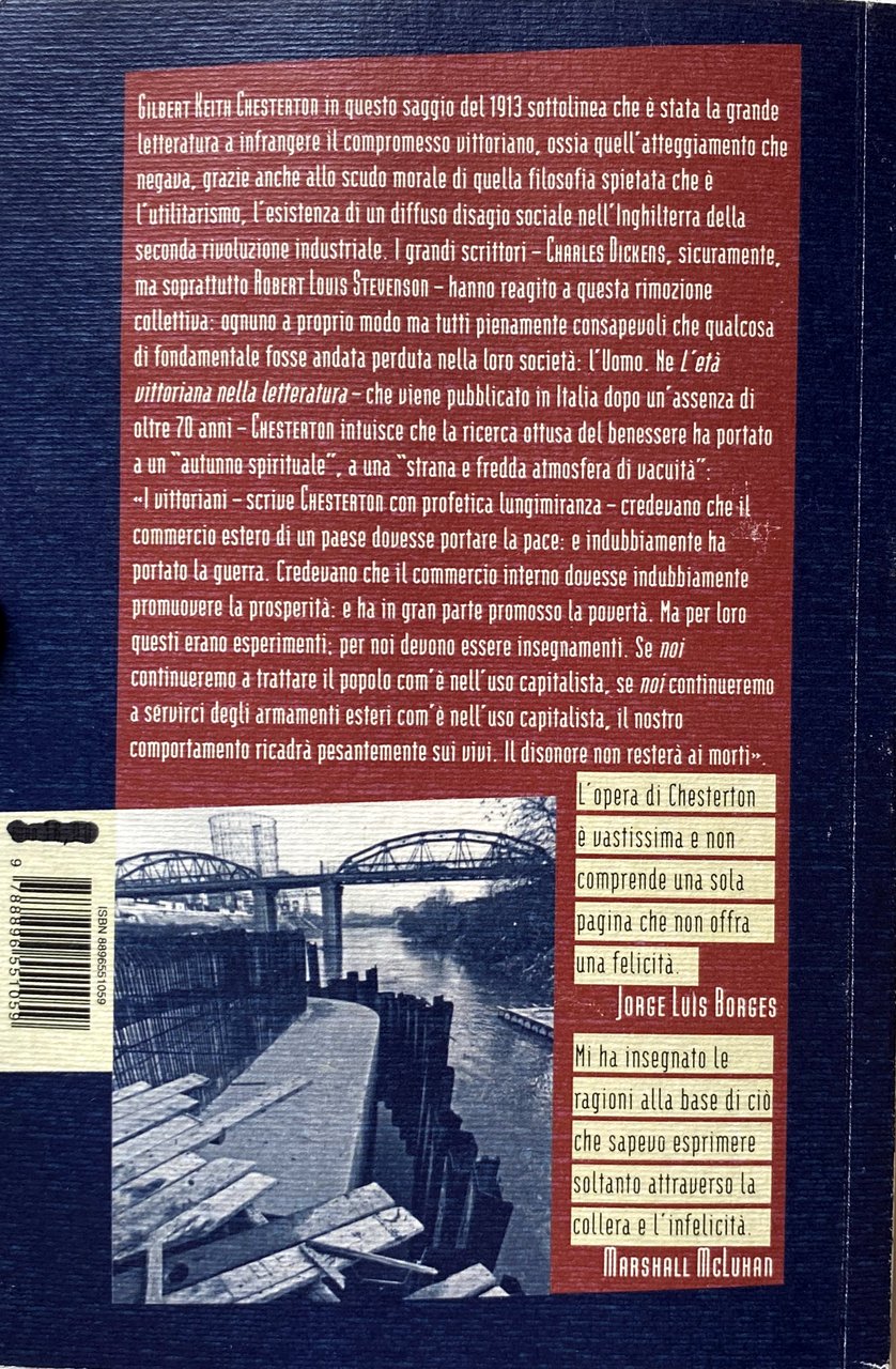 Gilbert Keith Chesterton in questo saggio del 1913 sottolinea che la letteratura ha infranto il compromesso vittoriano che negava, grazie anche allo scudo morale offerto dall'utilitarismo, l'esistenza di un diffuso disagio sociale nell'Inghilterra della seconda rivoluzione industriale. I grandi scrittori, Dickens, sicuramente, ma soprattutto Stevenson, reagiscono a questa rimozione collettiva: ognuno a proprio modo ma tutti pienamente consapevoli che qualcosa di fondamentale fosse andata perduta nella loro società. L'Uomo. GKC intuisce che la ricerca ottusa del benessere ha portato a un autunno spirituale, a una strana e fredda atmosfera di vacuità: I vittoriani, scrive, credevano che il commercio estero dovesse portare la pace: e ha portato la guerra. Credevano che il commercio interno dovesse promuovere la prosperità: e ha in gran parte promosso la povertà. Ma per loro questi erano esperimenti; per noi devono essere insegnamenti. Se noi continueremo a trattare il popolo com'è nell'uso capitalista, se noi continueremo a servirci degli armamenti esteri com’è nell'uso capitalista, il nostro comportamento ricadrà pesantemente sui vivi. Il disonore non resterà ai morti.