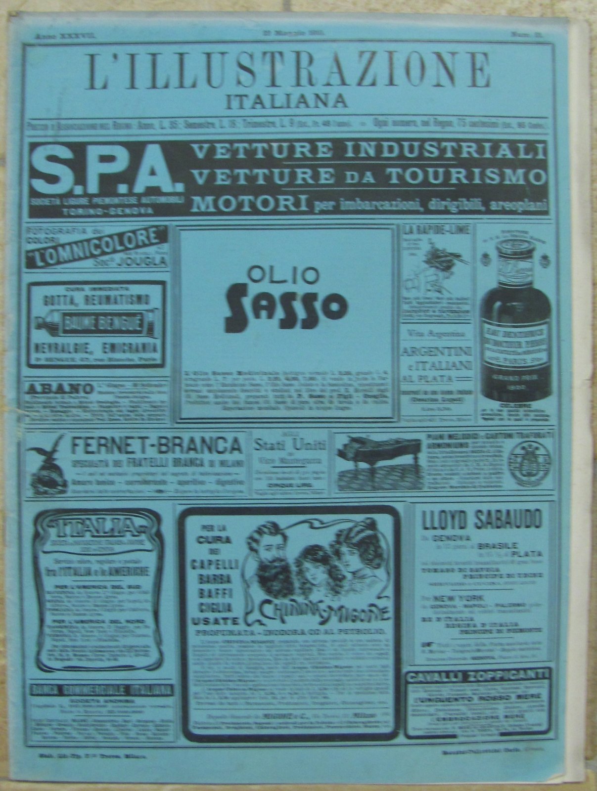 L'ILLUSTRAZIONE ITALIANA 22 MAGGIO 1910 ARGOMENTI LA COMETA DI HALLEY- TURCHI E TRIESTINI A MILANO- IL CINQUANTENARIO DEI MILLE A MARSALA- IL PREMIO DEL COMMERCIO A SAN SIRO- GARE D'AVIAZIONE ED AUTOMOBILI A PALERMO E VERONA- IL MONUMENTO DI ALESSANDRO II A PIETROBURGO- DALLA PROCLAMAZIONE DI GIORGIO V AI FUNERALI DI EDOARDO VII- REGINETTA DI SABA COPERTINA IN CARTA AZZURRA LEGGERMENTE SBIADITA AI MARGINI, LE PAG. 515-518 SONO STACCATE, DA PAG 505 A PAG.528