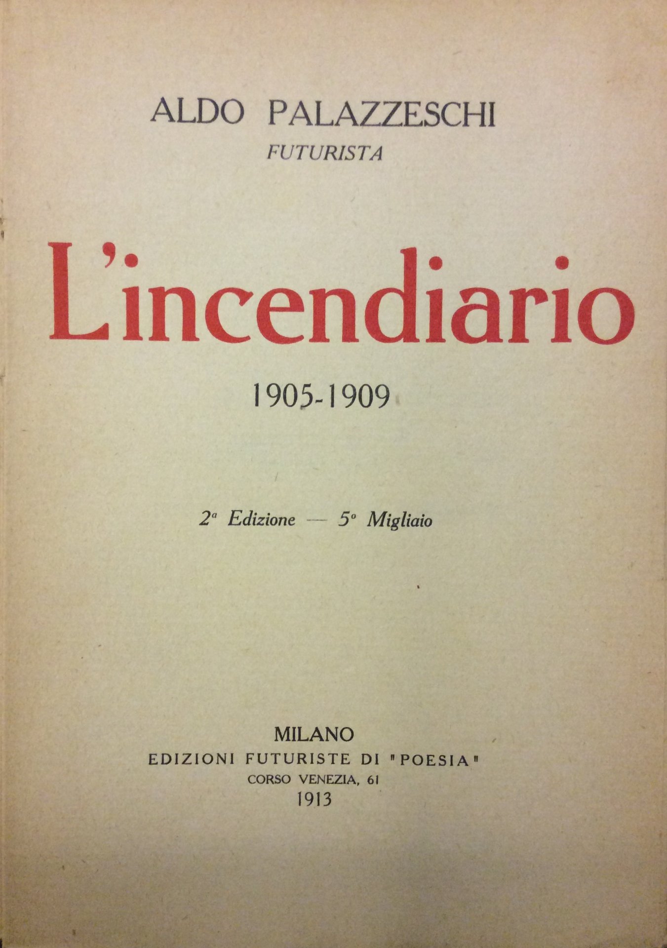 In-16 gr., brossura orig. (con fiorit.), pp. 253,(3). Comprende poesie da I Cavalli Bianchi', da Lanterna', da Poemi, da L'Incendiario' (la cui prima edizione è del 1910). Così Gambetti / Vezzosi, p. 610. Cfr. anche Falqui, p. 73 .Esemplare ingiallito per la qualità della carta altrimenti ben conservato.