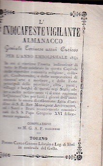 L' Indicafeste Vigilante. Almanacco Geniale Torinese assai curioso per l' anno embolismale 1842 in cui si rinviene l' esatta indicazione di tutte le Feste celebrate in questa Capitale dalle rispettive comunità religiose, collegii, Confraternite, e dalle corporazioni di ciascun' arte e mestiere, e delle Feste principali delle provincie, città, paesi, villaggi e borghi di questi regi Stati; oltre a molte notizie sacre vi si sono aggiunte leQuarant' Ore per tutti i giorni dell' anno secondo.