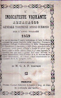 L' Indicafeste Vigilante. Almanacco Geniale Torinese assai curioso per l' anno embolismale 1849 in cui si rinviene l' esatta indicazione di tutte le Feste celebrate in questa Capitale dalle rispettive comunità religiose, collegii, Confraternite, e dalle corporazioni di ciascun' arte e mestiere, e delle Feste principali delle provincie, città, paesi, villaggi e borghi di questi regi Stati; oltre a molte notizie sacre vi si sono aggiunte le Quarant' Ore per tutti i giorni dell' anno secondo.