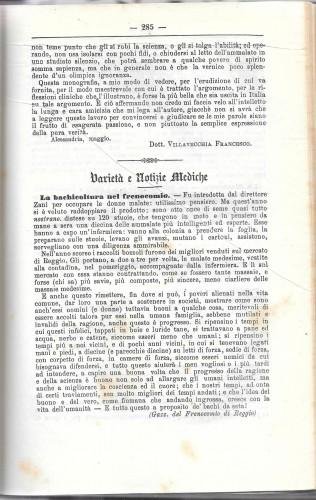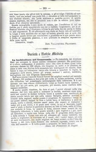 in 8°, pp. 4 nn., 576, 4 Indice delle Materie; leg. coeva m/tela blu con tit. in oro al ds. e piatti marmor. in tinta; annata completa della rivista che usciva il 5, il 15 e il 25 di ogni mese, per un totale di 36 nn., con moltissime Memorie scientifiche sui più svariati argomenti di medicina e chirurgia, indicazioni terapeutiche e pratiche mediche, apparecchiature scientifiche, proprietà e uso dei cibi, bibliografie e molto altro. Alcuni titoli dall'indice: Medicina e religione; Febbre intermittente e metrorragia; Della conservazione della vista; Angina difterica (il solfato fenato di chinina nella); Anestesia (morte per); Bromuro di canfora; Reumatismo (i cianuri nel); Varici (cura delle); Frenocomii (la bachicoltura nei); Manicomio di Alessandria; Narcotismo dei cavalli; Tempera del vetro; L'acqua del lago di Avigliana sotto l'aspetto igienico; etc. Lievi fior. 054/36