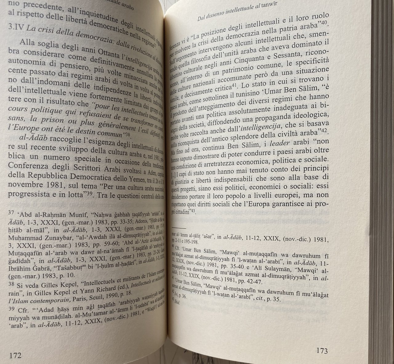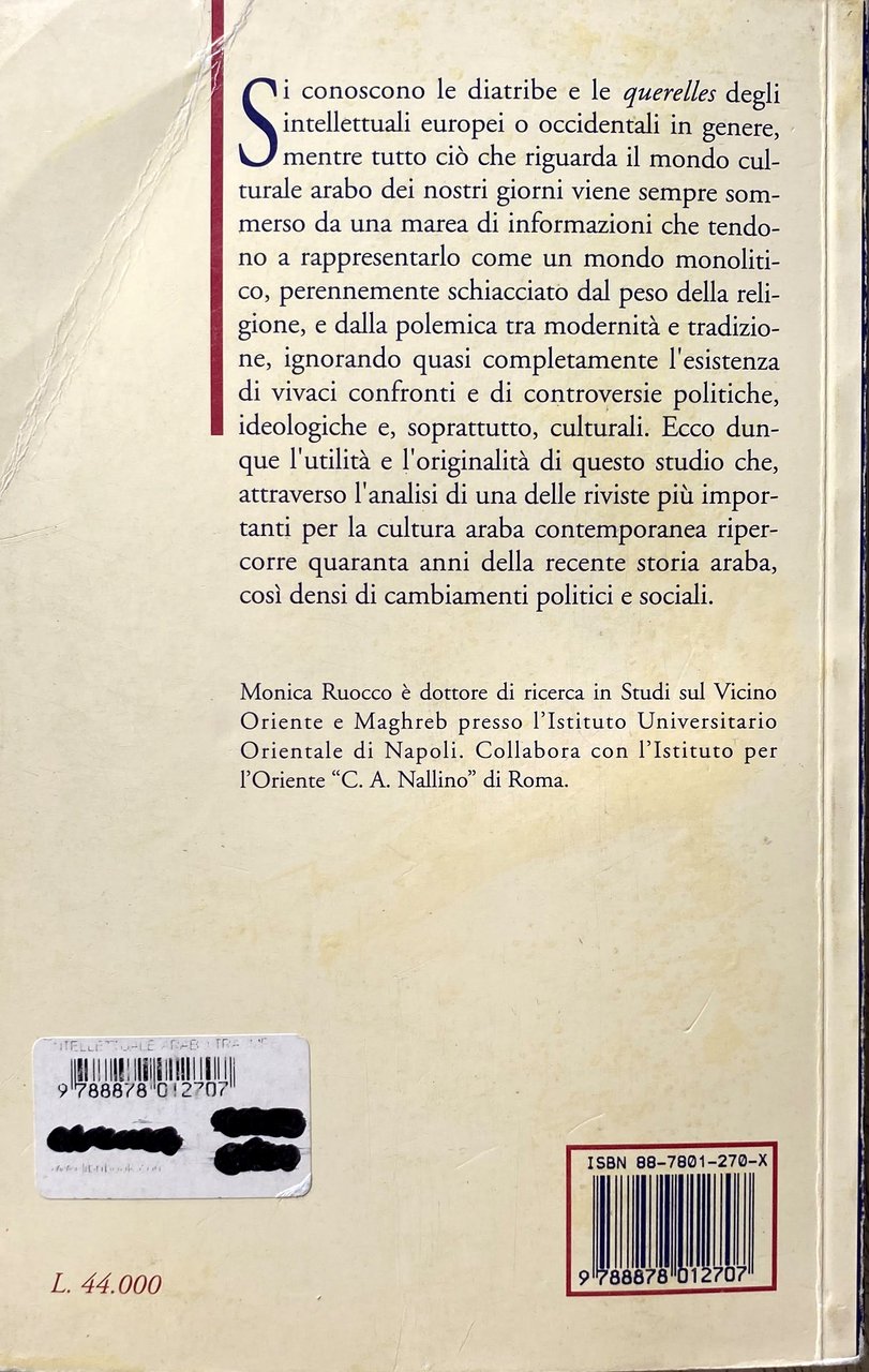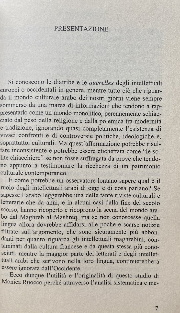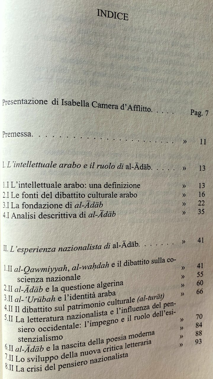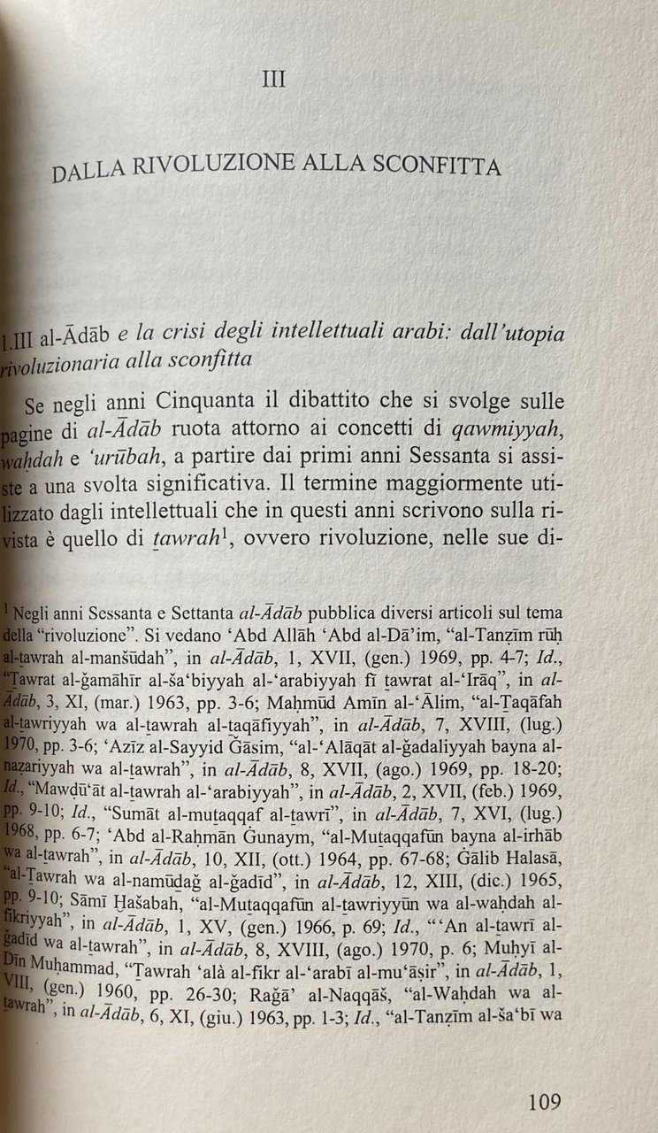 Soggetti: Mondo arabo Relazioni internazionali Politica Intellettuali Impegno politico Consenso Dissenso Critica Giornalismo Stampa Editoria Censura Opinione pubblica Potere Paesi arabi Medio Oriente Occidente Guerre Israele Antisemitismo Sionismo Palestina Conflitto arabo-israeliano Società Scienze sociali Sociologia Donne Emancipazione femminile Diritti umani Parità di genere Ruolo Riviste letterarie libanesi Libano Cambiamenti politici Storia araba Filosofia Antropologia Letteratura Cultura Esistenzialismo Avanguardia Suhayl Idris Les Temps modernes Simone de Beauvoir Jean-Paul Sartre Maurice Merleau-Ponty Guerra civile Fonti Identità Mahmoud Darwish Nazionalismo Influenza occidentale Crisi Resistenza Arabismo Islamismo Bibliografia Riferimento Al-multazim Impegno letterario Iltizam Liberazione Palestinesi Algerini Algeria Poesia Racconti Critica cinematografica Cinema Teatro Raif Khoury Salama Moussa Nazik Al Malaika Taha Hussein Abdel Rahman Badawi Egitto Iraq Tawfiq Sayigh Adunis Siria Shi'r Beirut élite culturali Progresso Fondamentalismo religioso Religione Islam Radicalismo Rivoluzione Romanzi Stusi Abd al-Da'im Abd al-Nahir Al-Rahman Abd Allah Allah Abu Zayd Adab Adonis Ahmad wa al-arabi al-arabiyyah al-Adab al-Din al-fikr al-mutaqqaf al-Naqqaš al-qawmi al-qawmiyyah Taqafah al-wahdah Algeria algerina Università Allah Antonio Pacheco Contemporanea Articoli Azmat Ba't Baghdad bayna Bayrut Beirut Cairo Redazione Giornalisti Scrittura Collaboratori Conferenza degli Scrittori Critica letteraria Damasco Dar Unione degli Scrittori Dibattiti Egiziani Gabra Hawqala Huri Husayn Ibid Ibrahim Idris Islamico Kuwait Lingua araba Lotta Mahmud Modern Arabic Mohammed Arkoun Muhammad Muruwwah Oriente Moderno Paolo Minganti Patrimonio culturale Pensiero Pubblicazioni Qahaya Qestione Ra'if huri Riyadh Romanzo Ruolo Said Sartre Scrittori Arabi Suhayl Idris Yusuf Zurayq Saggi Libri Vintage fuori catalogo Collezionismo Yemen Arabia Saudita Emirati arabi Oman Scienze Damasco Formazione Adonis Akka Amman Allus Nagi Aleppo Baghdad Camus Colonialismo Francia Dakrub Chomsky Democrazia Teocrazia Al Fatah Fournier Foucault Marocco Gabra Vietnam Gerusalemme Giordania Hasabah Heidegger Haydari Buland Huri Khomeini Iran Allah Sunniti Sunna Mecca Lukacs Lowenthal Lévinas Nazik Malaikah Martino Moreno Marxismo Socialismo Marifah Naksah Minganti Naqqas Raga Nasser Arafat OLP Propp Pasolini RAU Rushdie Tawrah Tawryyah Qabbani Ricoeur Questione Attualità Scarcia Amoretti Allah Territori occupati Sionismo Stati Uniti America Odio Settlement Sufismo Sciiti Russia Tunisia Wannus Mashreq Maghreb Turchia Antonio Gramsci Max Weber Marx Etudes Arabes Pierre Bourdieu Barbulesco Golfo Petrolio Ricchezza Monarchia Militanza Gilles Kepel Intelligencija Poeti Nabka Muezzin Giudaismo Ebrei Insediamenti Occupazione Occupation Arab world International relations Politics Intellectuals Political commitment Consensus Dissent Criticism Journalism Press Publishing Censorship Public opinion Power Countries Middle East West Wars Israel Antisemitism Zionism Palestine Arab-Israeli conflict Society Social sciences Sociology Women Women's empowerment Human rights Gender equality Role Lebanese literary magazines Lebanon Changes politicians Arab history Philosophy Anthropology Literature Culture Existentialism Avant-garde Civil war Sources Identity Nationalism Western influence Crisis Resistance Arabism Islamism Bibliography Reference Liberation Palestinians Algerians Poetry Stories Film criticism Theater Egypt Syria Progress Religious fundamentalism Religion Radicalism Revolution Novels Contemporary University Articles Editorial Staff Journalists Writing Collaborators Writers' Conference Literary criticism Damascus Union of Writers Egyptian Debates Struggle Orient Cultural Heritage Thought Publications Question Novels Fiction Role Writers Essays Books out of print Collectibles Saudi Emirates Sciences Damascus Education Colonialism France Democracy Theocracy Morocco Jerusalem Jordan Marxism Socialism Miners Issue Current Affairs Occupied Territories Zionism United States Hatred Sufism Shiites Turkey Gulf Oil Wealth Monarchy Militancy Poets Judaism Jews