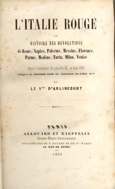 L'ITALIE ROUGE. Ou Histoire des revolutions de Rome, Naples, Palerme, Messine, Florence, Parme, Modène, Turin, Milan, Venise depuis l'avénement du Pape Pie IX en Juin 1846 jusq'a sa rentrée dans sa capitale, en avril 1850.