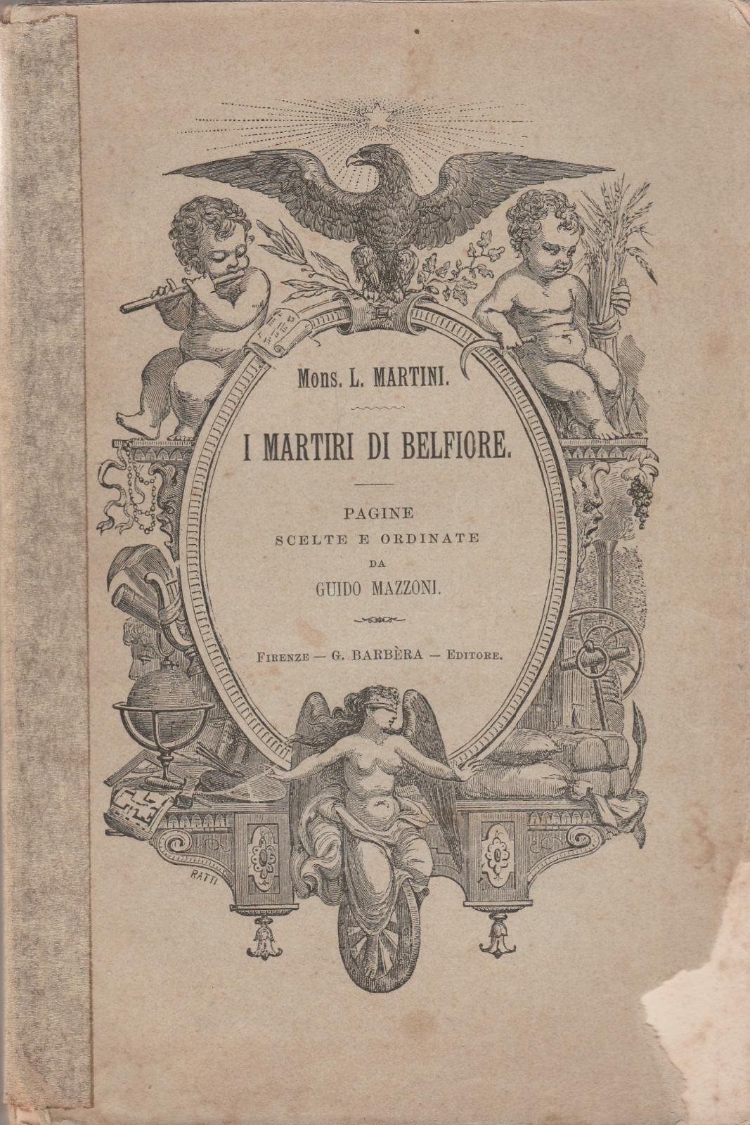 MONSIGNOR L. MARTINI MARTIRI DI BELFIORE PAGINE SCELTE ORDINATE DA GUIDO MAZZONI 2∞ EDIZIONE, FIRENZE G BARBERA EDITORE 1904 6207 COPERTINA MORBIDA EDITORIALE CON UNA MANCANZA ALL'ANGOLO INFERIORE ESTERNO FIORITURE E ALONI AL PIATTO ANTERIORE E MACCHIE DI INCHIOSTRO ALLA QUARTA DI COPERTINA DORSO ASSENTE LE DUE COPERTINE SONO UNITE DA NASTRO ADESIVO IN CARTA IN PARTE STACCATO, ANTIPORTA CON FIRMA DI POSSESSO E LIEVI FIORITURE, FIRMA DI POSSESSO E LIEVI FIORITURE ANCHE ALLA PAGINA BIANCA E AL FRONTESPIZIO, TAGLI IRREGOLARI CON ALCUNE MACCHIE DI INCHIOSTRO INTERNO IN BUONO STATO SONO PRESENTI FIORITURE AL TESTO NUMERO PAGINE 264 DIMENSIONI CM 19 X 12,6