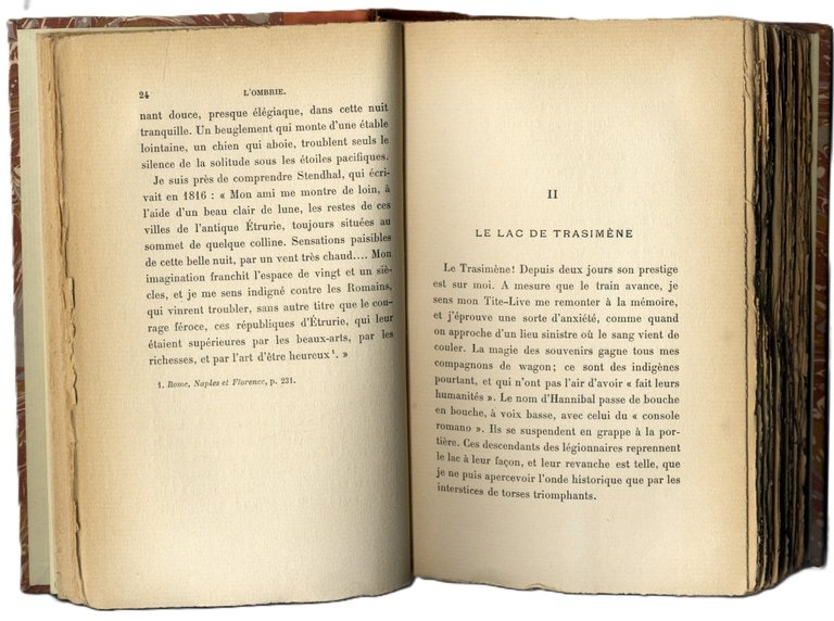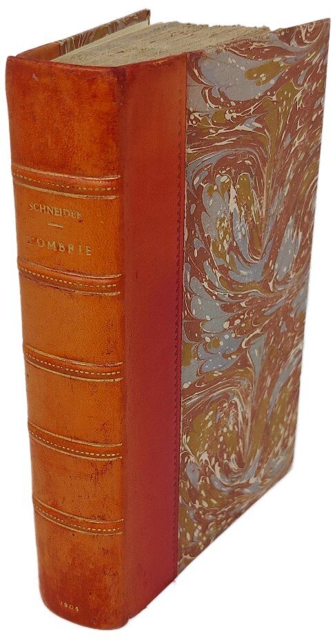 >in-16, pp. VIII, 274, leg. m. pelle, dorso a nervi con tit. e filetti oro, ambedue le cop. edit. cons. Commosse impressioni di viaggio a Cortona, lago Trasimeno, Perugia, Assisi, Spello, Montefalco, sorgenti e tempio del Clitunno e Spoleto. Ottimo esemplare, in barbe.