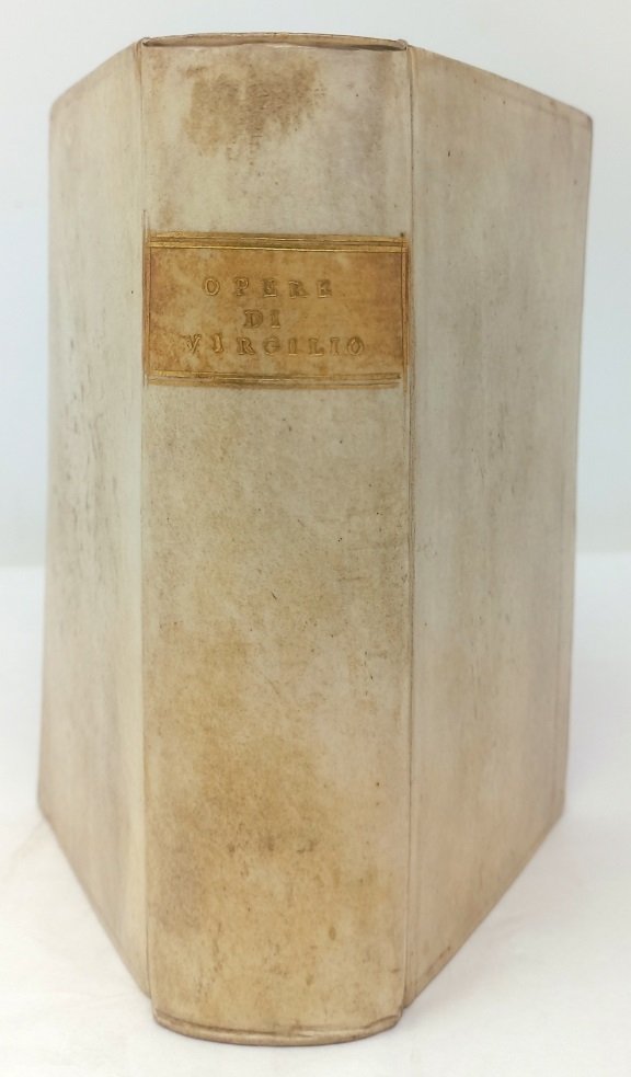 >in-8 (mm 160x100), ff. 352, (2 di Errata), testo in carattere corsivo. Legatura del XVIII secolo in pergamena rigida, titolo oro al dorso, tagli rossi. Impresa editoriale al titolo ed altra diversa in fine, grandi e belle iniziali istoriate. Prima edizione complessiva ''...della nota opera di Virgilio, anche dal lato tipografico. Traduttori furono per le Bucoliche Andrea Lori, per le Georgiche Bernardino Daniello, per i libri dell'Eneide Alessandro Sansedoni'' (Mambelli). ''Tra le non poche raccolte di traduzioni da varii fatte delle Opere tutte di Virgilio merita questa la preferenza, e siccome più d'ogni altra ed elegantemente impressa, è tenuta principalmente in stima dai bibliografi'' (Gamba). Ottimo esemplare di edizione importante e non comune. Ex-libris del Conte della Trinità al contropiatto anteriore. Mambelli, Virgilio 769. Annali Giunti 296. Gamba 1740.