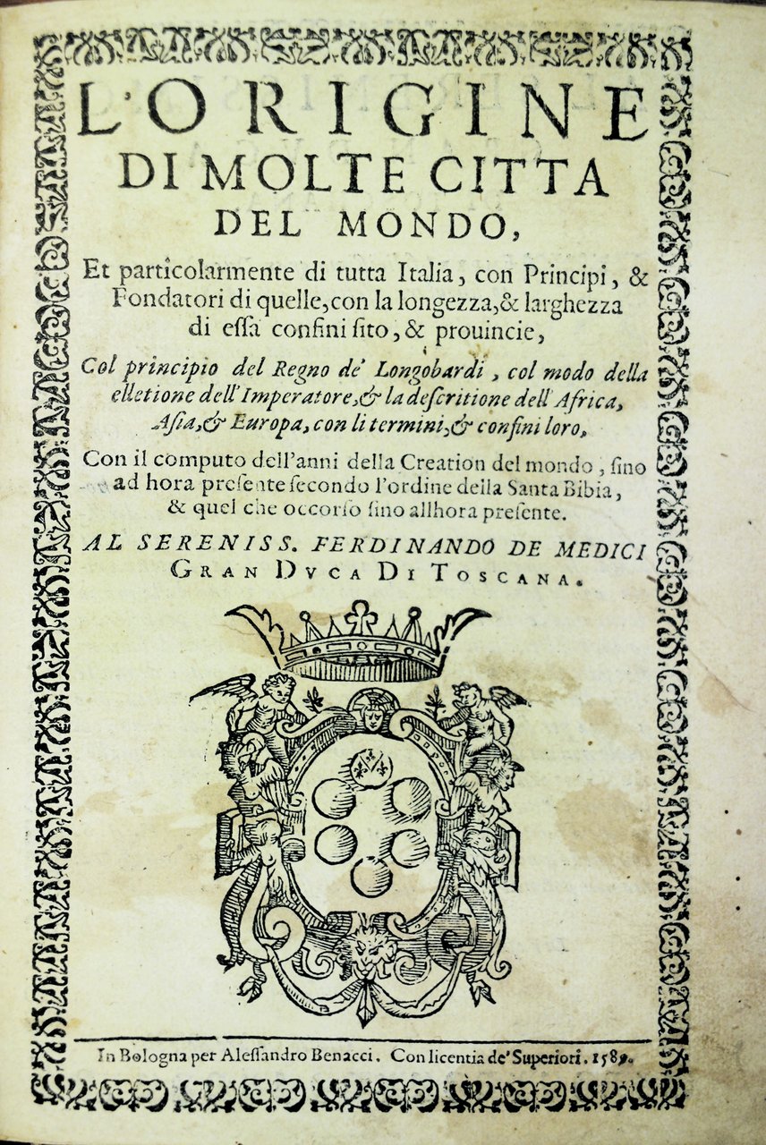 L'ORIGINE DI MOLTE CITTA' DEL MONDO. - Et particolarmente di tutta Italia, con Principi, & Fondatori di quelle, con la longezza, & larghezza di essa confini sito, & provincie....