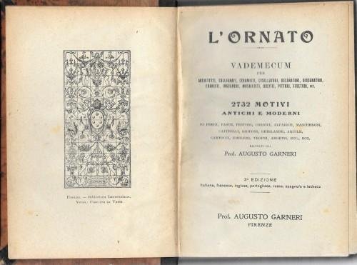 3^ ediz., in 16°, pp. 337, leg. coeva m/tela con tit. in oro al ds., tagli spruzz., ritratto dell'A. all'antip.; testo di presentaz. ed indice analitico in 7 lingue con figure differenti per ciascuna; "per architetti, calligrafi, ceramisti, cesellatori, decoratori, disegnatori, ebanisti, ingegneri, mosaicisti, orefici, pittori, scultori, ecc.". 415/28