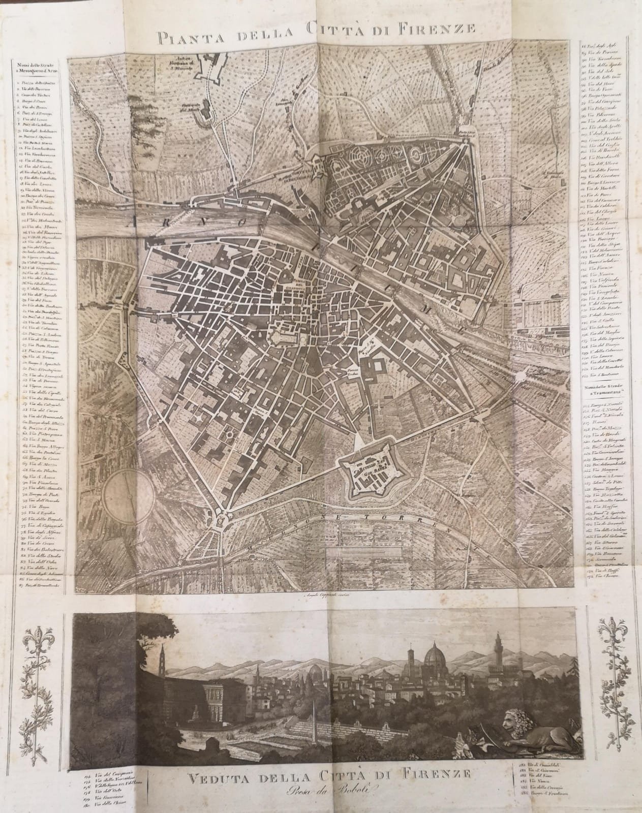 In-8 p. (mm. 245x165), 8 volumi, brossura (lievi mancanze), pp. compl. 1500 ca., con una grande pianta di Firenze, piu' volte ripieg., che porta anche una veduta della citta' presa da Boboli e 16 tavole inc. in rame. Interessante opera che illustra i monumenti di Firenze, suddivisi nei quartieri di S. Giovanni, S. Maria Novella, S. Croce e S. Spirito, e fa la storia della citta', dei suoi usi e costumi, dei suoi progressi nelle arti e nelle scienze. Terza ediz. eseguita sopra quella del 1797, riordinata e compiuta dall'Autore, coll'aggiunta di varie annotazioni del Prof. G. Del Rosso. Con fioriture e/o arrossature intercalate nel testo, peraltro in buono stato.