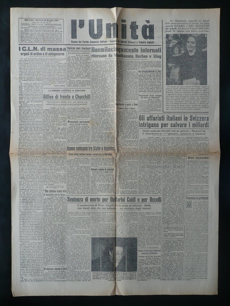 Quotidiano, Duemilacinquecento internati ritornano da Mauthausen, Dachau e Allag" e "Sentenza di morte per Buffarini Guidi e per Uccelli" in "L'Unità" Organo del Partito Comunista Italiano Anno 22 - Numero 43 Milano, Martedì 29 Maggio 1945 Edizione dell'Italia Settentrionale Milano 1945, cm 58x42, pp. 2 con due ill. in b/n n. t. Numero completo. Condizioni di conservazione Esemplare in buone condizioni con tracce d'uso, normali pieghe di conservazione, poche minuscole e pressoché trascurabili bruniture; minimi accenni d'ingialliture dovute all'età in corrispondenza delle pieghe. Edizione dell'Italia Settentrionale. Numero completo. SC03.D10107 N "