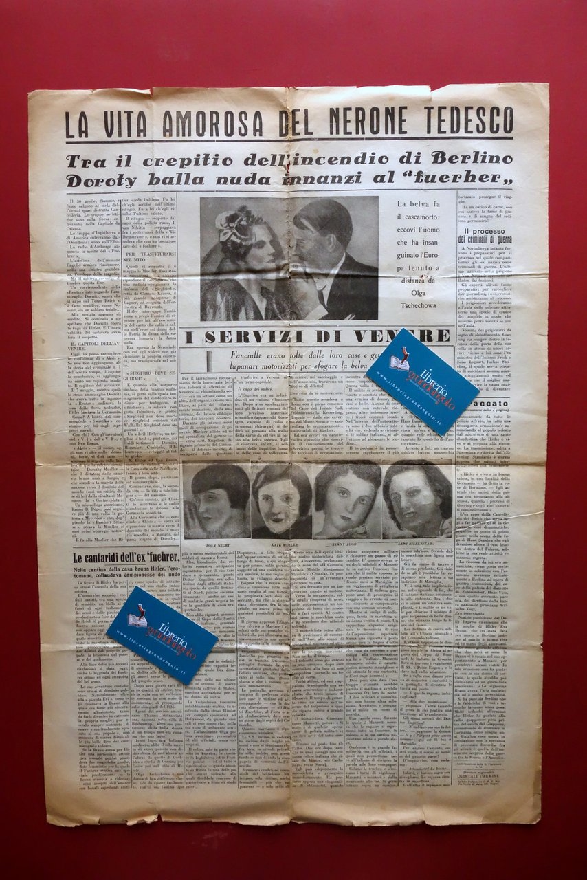 Giornale (edizione unica), † L'uomo che rovinÚ l'Europa Hitler in gabbia sta per scoccare l'ora per il criminale numero 1†[.]" Istituto Poligrafico IPEM, Napoli, s. d. ma 1945; edizione unica di giornale a stampa, ill. in b/n; pp. 2 non num. (foglio fronte - retro). Completo. Cm 64x43,5. † Condizioni di conservazione Complessivamente in buone condizioni con tracce d'uso, leggero ingiallimento della carta e alcune piccole lievi bruniture, normali pieghe per conservazione, alcuni piccoli / minimi marginali strappetti. Per ulteriori dettagli vedi foto. † Edizione unica, completa (foglio fronte - retro). † SC03.D19633 N "