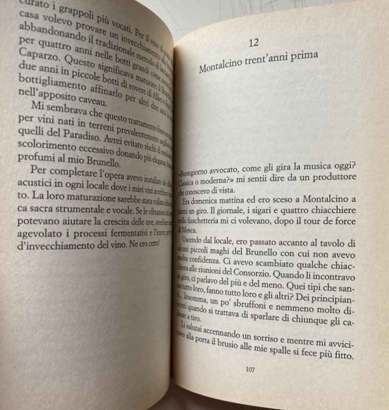 Incurante degli scettici e dei cinici, l'ex avvocato realizza il suo sogno attirando su di sé l'attenzione delle università e del guru del suono Amar Bose. Insieme, finiranno per spalancare le frontiere della biosonorità, avanguardia del biologico. Il taglio coraggioso con il passato, un sogno realizzato con caparbietà, una terra incantata come la Val d'Orcia, un vino raffinato come il Brunello e il fascino antico di Montalcino regalano una storia appassionante che tutti, segretamente, vorremmo vivere.