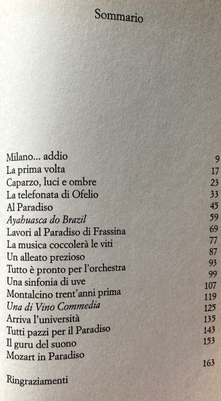 Soggetti: Biografie, Autobiografie, Memorie, Enologia, Vino, Vitigni, Cantine, Vini rossi italiani, Vitis vinifera, Fono biologica, Bright Green Book, Natura, Agricoltura, Tecnologie, Vite Coltivazioni biologiche, Biologia, Ecologia, Ambiente, Storia autobiografica, Toscana, Musica classica, Mozart, Sensibilità, Piante, Vibrazioni acustiche, Suoni, Casse acustiche, Università, Sangiovese, Coltivazioni, Note, Vivaldi, Maturazione anticipata, Parassiti, Federico Ricci, Agronomia, Paradiso di Frassina, Azienda biologica, Rame, Zolfo, Trattamenti, Vendemmia, Pioggia, Muffa, Umidità, Vigne, Terreno sano, Falde acquifere, Grappolo, T. H. Singh, Botanica, Stimoli musicali, Cleve Backster, Macchina della verità, Poligrafo, Emozioni umane, Teorie, Frequenze sonore, Cellule, Fattore di crescita cellulare, Microcorrenti, Molecole, Diffusione, Proteine, Van Doorne, Scale resonance, Joel Sternheimer, Metodo, Regolazione epigenetica, Biosintesi, Risonanza di scala, Catena, Aminoacidi, Ribosoma, Melodia, Contesto ambientale, Produzione, Canto, Uccelli, Weinberger, Sinergia, Mondo vegetale animale, Virus, Enzimi, Sopravvivenza, Esperimenti, Byers, Illuminazione artificiale, Luce, Ultrasuoni, 50mila Hz, Effetti, Ormoni, Auxina, Animali Nocivi, Insetti, Topi, Talpe, New Age, Pomodoro, Coghlan, Pomodori, Senegal, Siccità, Sternheimer, Raccolto, Acqua, TAS14, Frutti, Dan Carlson, Michael Holtz, Purple Passion, Tompkins & Bird, Storie vere, Bestseller, Progetti eco-sostenibili, Sostenibilità, OGM, Chimica, Filari, Metabolismo, Processi fisiologici, Professore Mancuso, Neurologia vegetale, Entomologia, Professor Luchi, Amar Boose, Audio, MIT, Acustica, Armonia, Cicaline, Flavescenza dorata, Fibonacci, Numeri, Sequenze, Barbatelle, Selezione, Uve, Uva, Brunello Riserva Flauto Magico, Maremma, Super Cru, Degustazione, D.O.C., Crazy Blend, Bach, Cinigiano, Amiata, Rosso, Barriques, Campi elettromagnetici, Gravità, Sud Corea, Cina, Esperimenti sperimentali, Wang, Lee, Stress, BOSE environmental, Agenti atmosferici, Velocità di crescita, Settembre, Ottobre, Cicadellide Scaphoideus Titanus, Entomofauna, Vegetazione, Collezionismo, Libri rari Vintage fuori catalogo, Poderi, Bibliografia, Riferimento, Da collezione, Biographies, Autobiographies, Memoirs, Oenology, Wine, Vineyards, Cellars, Italian red wines, Vitis vinifera, Biological sound, Nature, Agriculture, Technologies, Vine Organic farming, Biology, Ecology, Environment, Autobiographical history, Tuscany, Classical music, Sensitivity, Plants, Acoustic vibrations, Sounds, Loudspeakers, University, Sangiovese, Cultivations, Notes, Early maturation, Parasites, Agronomy, Paradise, Organic company, Copper, Sulphur, Treatments, Harvest, Rain, Mould, Humidity, Vineyards, Healthy soil, Groundwater Aquifers, Cluster, Botany, Musical stimuli, Lie detector, Polygraph, Human emotions, Theories, Sound frequencies, Cells, Cell growth factor, Microcurrents, Molecules, Diffusion, Proteins, Method, Epigenetic regulation, Biosynthesis, Chain, Aminoacids, Ribosome, Melody, Environmental context, Production, Song, Birds, Synergy, Plant animal world, Viruses, Enzymes, Survival, Experiments, Artificial lighting, Light, Ultrasounds, 50 thousand Hz, Effects, Hormones, Auxin, Pests, Insects, Mice, Moles, Tomatoes, Drought, Harvest, Water, Fruits, True stories, Eco-sustainable projects, Sustainability, GMOs, Chemistry, Filamentous plants, Metabolism, Physiological processes, Plant neurology, Entomology, Acoustics, Harmony, Leafhoppers, Flavescence dorée, Numbers, Sequences, Rooted Roots, Selection, Grapes, Grapes, Magic Flute Reserve, Tasting, Red, Electromagnetic Fields, Gravity, South Korea, China, Experimental Experiments, Atmospheric Agents, Growth Rate, September, October, Entomofauna, Vegetation, Collecting, Out-of-print rare books, Estates, Bibliography, References, Collector's items