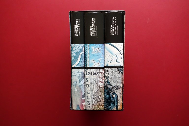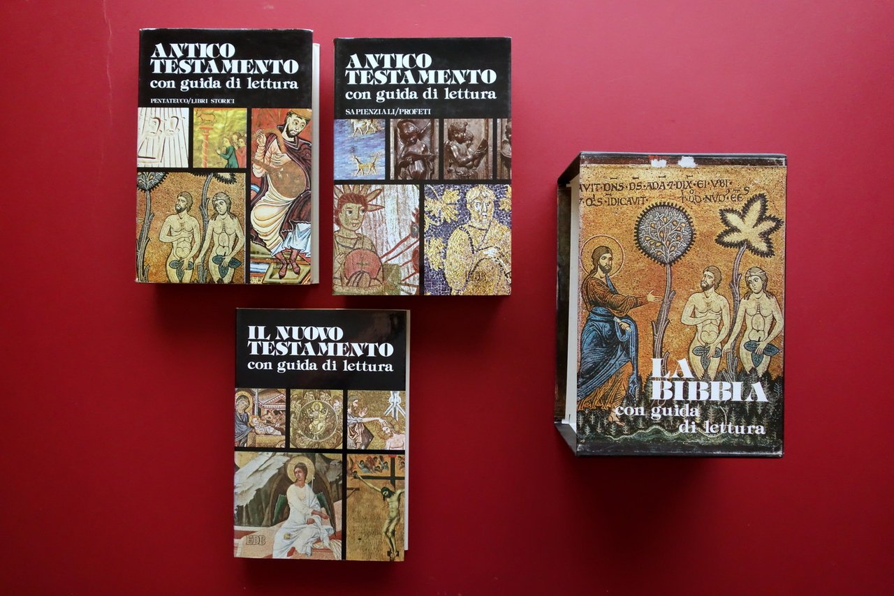 La Bibbia con guida di lettura - Antico Testamento I. Pentateuco e Libri Storici II. Libri sapienzali e Profeti - Nuovo Testamento Edizioni Dehoniane, Bologna 1982; cm 25,5x17; pp. 878 (antico testamento-I); pp. 988 (antico testamento-II); pp. 574 (nuovo testamento), tutti con varie ill. a colori fuori t.; tutta tela ed. con titolo al dorso e al piatto ant., sovraccoperta ed. ill. a colori. Opera completa in tre volumi, inseriti entro cofanetto ed. in cartonato ill. a colori. Condizioni di conservazione Volumi tutti e tre in condizioni pressoché ottime con minime tracce d'uso alle sovraccoperte ed., quella del volume Antico Testamento-I con qualche piccolo lieve alone e pressoché trascurabili mancanze alle cuffie. Interni ottimi. Cofanetto ed. in condizioni più che buone con un paio di piccole abrasioni a un margine superiore, marginali leggere tracce di sporco e minimi difetti. Introduzioni e guida di lettura di J. P. Bagot; le note sono di L. M. Dewailly. Traduzione italiana di Girolamo Carraro. Opera completa in tre volumi contenuti entro cofanetto editoriale. SETT41.L26385 N