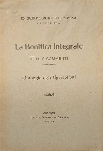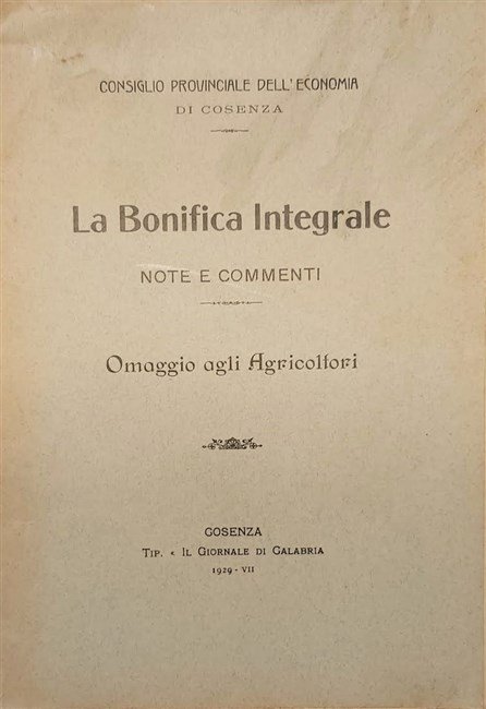 in-8, pp. 90, bross. edit. Composto da tre sezioni: la circolare del Duce e la legge; disposizioni legislative per la bonifica, opere idrauliche, credito, pascoli montani, costruzioni rurali, strade, acquedotti, energia elettrica, etc.; legislazione agraria fascista con particolare riferimento alla provincia di Cosenza (battaglia del grano). [127]