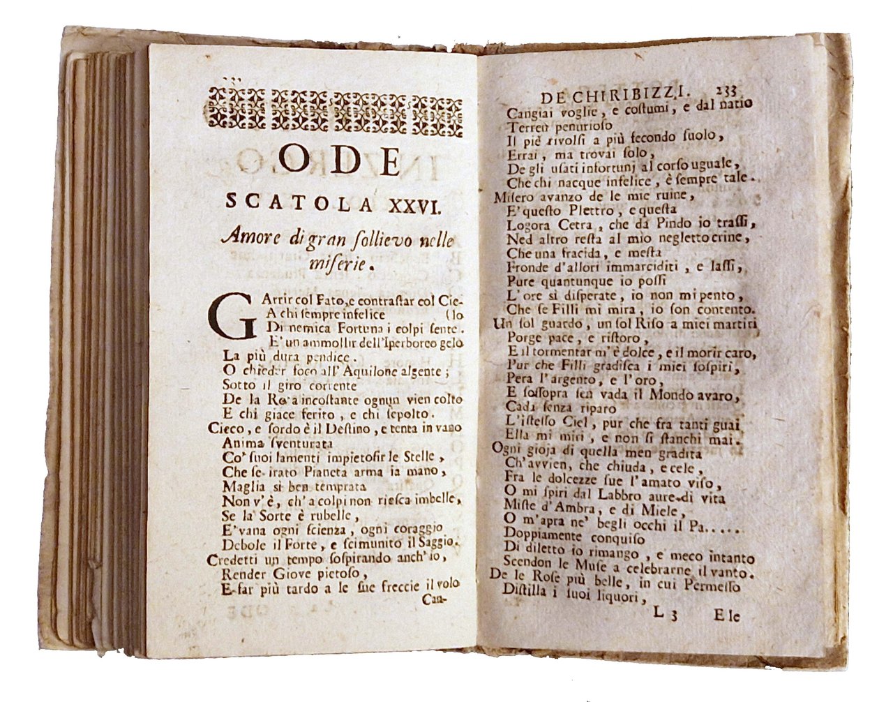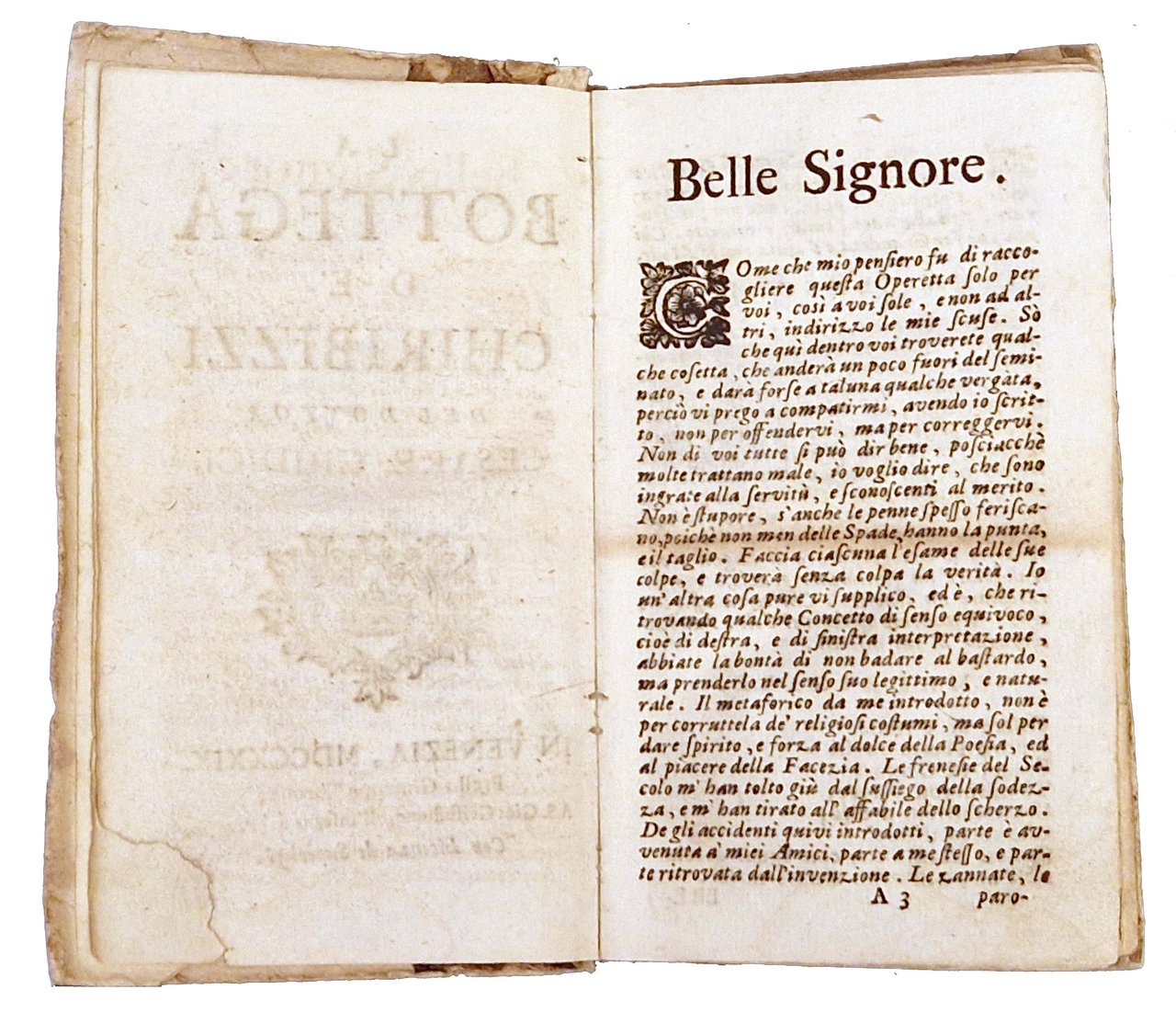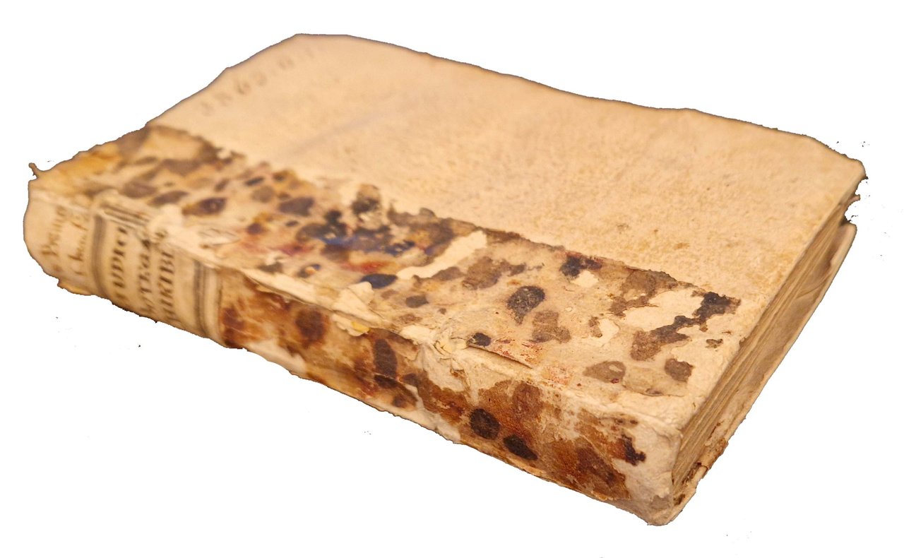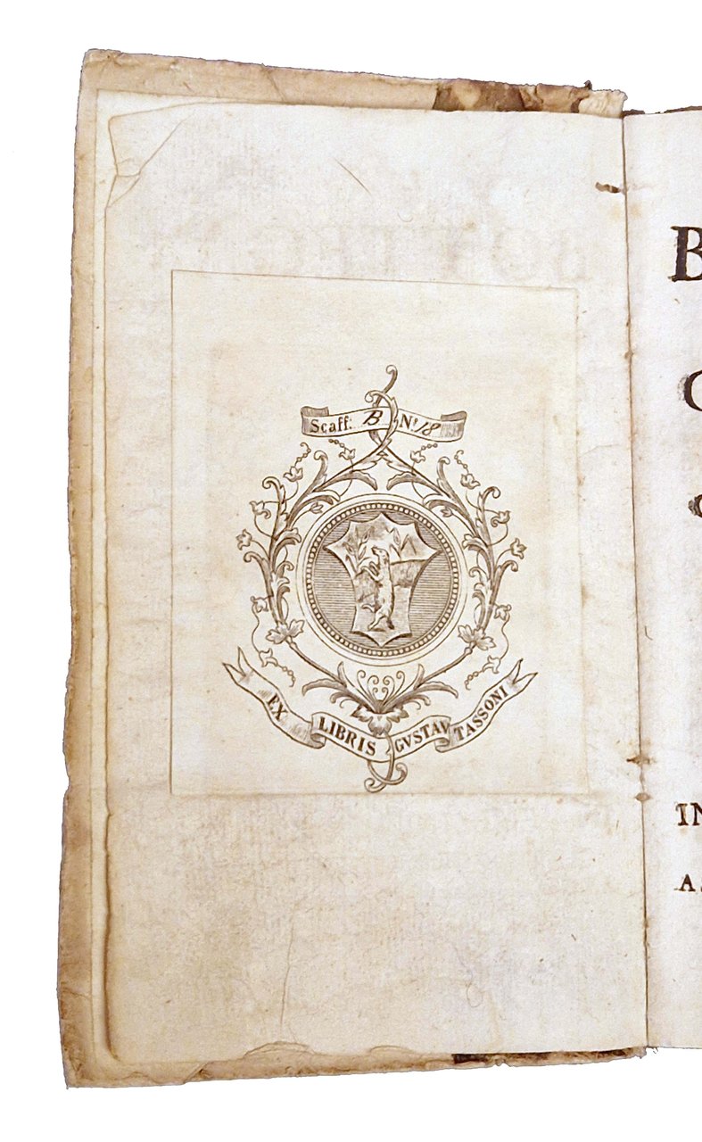 in-12°, 148x86 mm, leg. coeva in carta marmorizzata e cartone muto, con vecchio titolo sul dorso in cartonato muto e su nuova etichetta incollata sempre al dorso; pp. [12], 276, [2]. Fregio xilogr. sul frontespizio. La carta B6 erroneamente segnata A6. Iniziali, testatine e finali xilografici. L’opera più originale e verosimilmente la migliore di Cesare Giudici, che contiene, in ventotto sezioni, o “scatole”, componimenti dei più vari generi e metri e da cui, con parecchi altri, è stato recuperato un sonetto stampato, poi trascritto con grafia decorosa utilizzandone lo stesso titolo di “Orologio Solare in un muro d’un cacatoio“. Questo esemplare è della seconda edizione veneziana dell'opera del Giudici, pubblicata la prima volta a Milano nel 1685. Di Cesare Giudici non è conservata alcuna traccia nelle storie letterarie: le sole notizie che lo riguardano sono ricavabili da Filippo Argelati (“Philippi Argelati … Bibliotheca scriptorum Mediolanensium…), che ritiene Cesare Giudici nobile milanese, nato il 25 giugno del 1634, laureato in diritto, dedito però alle lettere, e studioso operante nel Collegio Borromeo; morì ottantanovenne il 19 marzo del 1724. Prov.: Importante ex-libris incollato al verso della prima carta libera anteriore (Ex libris Gustavo Tassoni). Rif.: IT\ICCU\RT1E\002655. OCLC, 29074728. Cond.: Segni di uso alla legatura (forti abrasioni alla carta marmorizzata al dorso e all'etichetta col titolo). Carte pulite. Piccolo strappo con mancanza di carta nell'angolo inferiore del frontespizio, non interessante titolo e testi scritti. Esemplare nel complesso in buone condizioni.