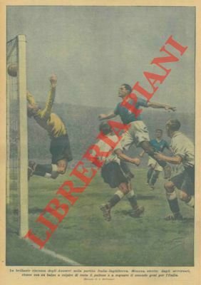La brillante riscossa degli Azzurri nella partita Italia-Inghilterra. Meazza, stretto dagli avversari, riesce con un balzo a colpire di testa il pallone e a segnare il secondo goal per l'Italia.