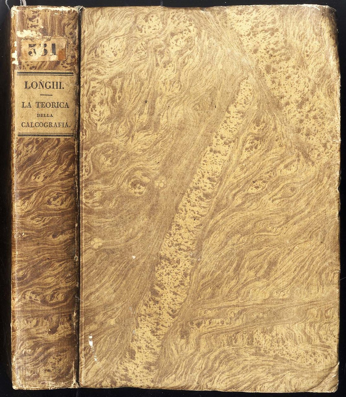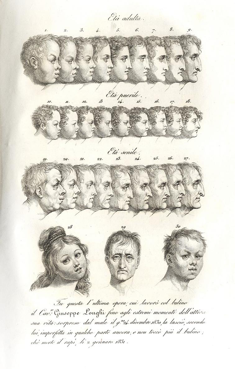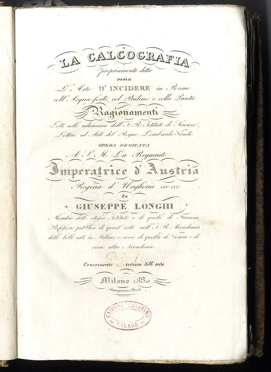 >in-8gr., pp. XXXII, 385 (4), 392-43 (3 tavole in calcografia, compreso il front.). Leg. coeva in cartonato decorato, titolo su tassello al dorso. Le tre tavole in calcografia sono: il frontespizio inciso in rame da Prada; l'ultima incisione a bulino a cui lavorò lo stesso Longhi, raffigurante uno studio sui profili umani, a cui è agggiunta una didascalia postuma che reca la data di morte dell'A. (2 gennaio 1831); un ritratto di Giuseppe Longhi entro medaglione, disegnato e inciso da Francesco Anderloni. A partire da pp. (386) segue, con occhietto prporio: ''Notizie biografiche di Giuseppe Longhi raccolte da Francesco Longhena''. Edizione originale dell'unico volume pubblicato poiché la morte dell'A. sopraggiunse nel gennaio dell'1831 e l'opera venne affidata dai suoi eredi a Francesco Longhena, che aggiunse l'ultima parte dedicata alla biografia del Longhi. Ottimo esemplare di importante trattato sull'incisione in rame, fresco e marginoso.