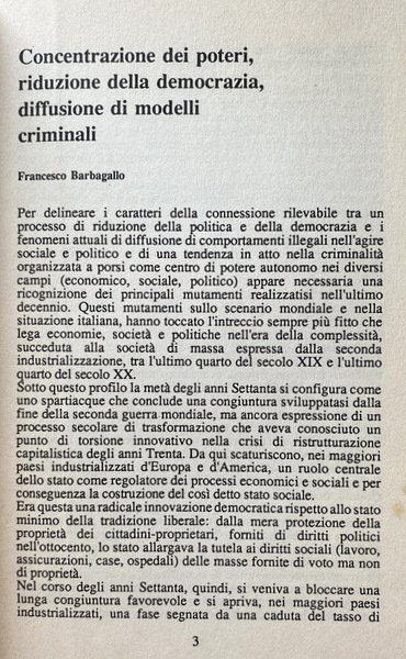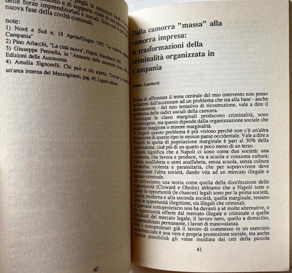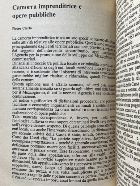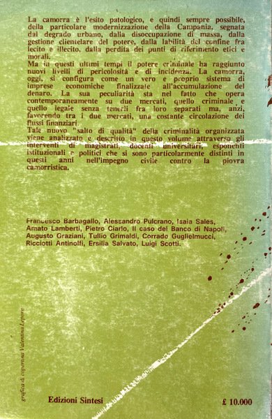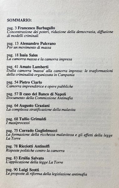 Soggetti: Traffici criminali, Camorra, Criminalità organizzata, Organizzazioni malavitose, Clan camorristici, Imprenditoria, Affari illegali, Illegalità, Crimine, Borghesia, Potere, Politica, Colletti bianchi, Clientelismo, Economia sommersa, Investimenti, Riciclaggio, Denaro sporco, Droga, Spaccio, Racket, Analisi sociologica, Storia, Campania, Sud, Mezzogiorno, Nord, Espansione, Lotta, Giustizia, Connivenza, Finanza, Banco di Napoli, Famiglie, Disoccupazione, Manovalanza, Baby-gang, Intellettuali, Società civile, Governi, Leggi, Modelli criminali, Impresa, massa, Appalti, Opere pubbliche, Lavori, Maxiprocesso, Processi, Ricchezza, Terremoto, Irpinia, Abusivismo, Ricostruzione, Rifiuti tossici, Legislazione antimafia, Anni Settanta, Anni Ottanta, ‘Ndrangheta, Cosa Nostra, Sicilia, Puglia, Calabria, Milano, Democrazia, Diritto penale, Legalità, Garantismo, Carcere, Difesa, Stato, Magistratura, Reportage, Giornalismo, Pino Arlacchi, Amalia Signorelli, Mezzogiorno, Enti locali, Costi, Libri Vintage Fuori catalogo, Riferimento, Bibliografia, Collezionismo, Saggistica, Questione meridionale, Pentitismo, Pentiti, Omicidi, Violenza, Carmine Alfieri, Casal di Principe, Castellammare di Stabia, Giuliano, Forcella, Scampia, Lauro, Maisto, Mancuso, Mattino, Pasquale Galasso, Secondigliano, Raffaele Cutolo, NCO, Nuvoletta, Antonio Gava, Indagini Preliminari, Corruzione, Corte d'Assise, Custodia cautelare, Eroina, Cocaina, Sostanze stupefacenti, Controllo del territorio, Narcotraffico, Boss, Professionisti conniventi, Business, Videopoker, Donne, Affiliati, Raccolte di scritti, Antologie, Libri rari, Criminal trafficking, Camorra, Organized crime, Underworld organizations, Camorra clans, Entrepreneurship, Illegal business, Illegality, Crime, Bourgeoisie, Power, Politics, White collar workers, Clientelism, Underground economy, Investments, Laundering, Dirty money, Drugs, Dealership, Sociological analysis, History, South, North, Expansion, Fight, Justice, Connivance, Finance, Families, Unemployment, Labor, Intellectuals, Civil society, Governments, Laws, Criminal models, Business, Tenders, Public works, Jobs, Maxiprocess, Processes, Wealth, Earthquake, Unauthorized, Reconstruction, Toxic waste, Anti-mafia legislation, Seventies, Eighties, Sicily, Democracy, Criminal law, Legality, Guarantee, Prison, Defense, State, Judiciary, Journalism, Local authorities, Costs, Books Out of Print, Reference, Bibliography, Collecting, Nonfiction, Southern Question, Pentitism, Repent, Murders, Violence, Preliminary Investigations, Corruption, Court of Assizes, Custody, Heroin, Cocaine, Narcotic substances, Territorial control, Narcotraffic, Conniving professionals, Women, Affiliates, Collections of writings, Anthologies, Rare books