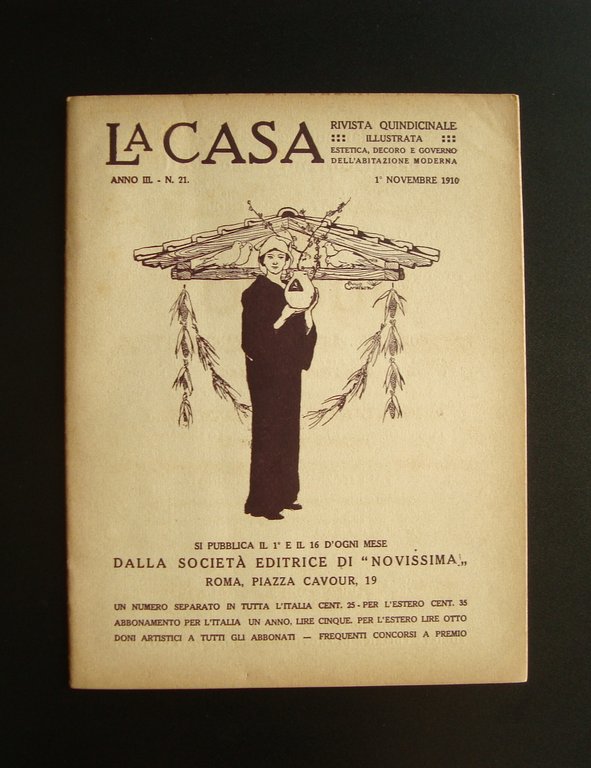 Rivista quindicinale illustrata, La Casa" "Estetica, Decoro e Governo dell'Abitazione Moderna" Anno III - Vol.II - N. 21 1 Novembre 1910 Società Editrice di "Novissima", Roma, 1910, cm 25x18,5, pp. da 402 a 420 (numerazione annuale); brossura ed. con ill. fotografiche in b/n. e disegni di Innocenti, Baruffi, Ferro. Numero completo. Condizioni di conservazione Esemplare in buone condizioni con tracce leggere d'uso e del tempo; brossure con qualche minima brunitura ai margini e al dorso; interni buoni Numero completo. RVS001N00189 "
