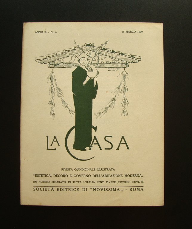 Rivista quindicinale illustrata, La Casa" "Estetica, Decoro e Governo dell'Abitazione Moderna" Anno II - Vol.I - N. 6 16 Marzo 1909 Società Editrice di "Novissima", Roma, 1909, cm 25x18,5, pp. da 102 a 120 (numerazione annuale); brossura ed. con ill. fotografiche in b/n. e disegni di Grassi, Bertoletti. Numero completo. Condizioni di conservazione Esemplare in buone condizioni con tracce leggere d'uso e del tempo; brossure con qualche minima brunitura ai margini e al dorso; interni buoni Numero completo. RVS001N00187 "