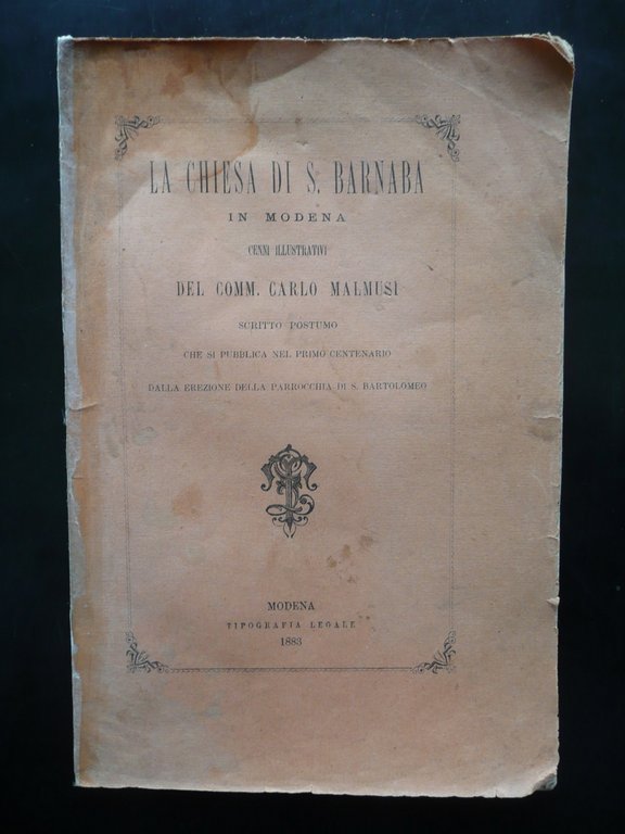 Carlo Malmusi, La Chiesa di S. Barnaba in Modena cenni illustrativi del Comm. Carlo Malmusi scritto postumo che si pubblica nel primo centenario dalla erezione della Parrocchia di S. Bartolomeo Tipografia Legale, Modena 1883, cm 23x15,5, pp. 56; brossura ed. Antiporta con una leggera traccia di vecchia etichetta applicata. Condizioni di conservazione: Esemplare complessivamente in buone condizioni con tracce d'uso e del tempo; brossure con alcuni lievi aloni; qualche minimo strappetto, pieghetta e piccole mancanze ai margini e agli angoli (queste ultime quasi tutte disposte al margine inf. e agli angoli della br. post., vedi foto); un angolo sup. della br. ant. con una leggera ombra di gora che non interessa gli interni. Dorso fessurato e con qualche piccola mancanza ma restaurato con carta giapponese, esemplare compatto. Interni buoni, angoli di alcune pagine con minime pieghette e/o tracce di pieghette. SETT89.L8092 N