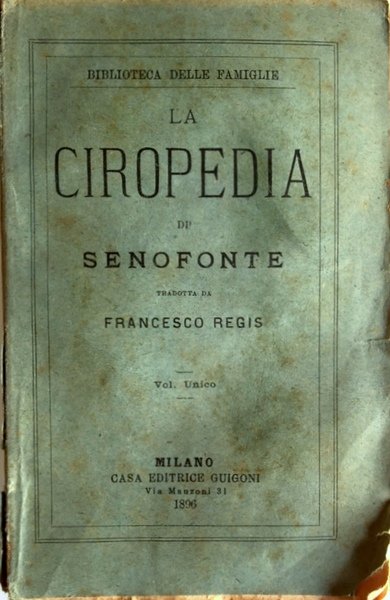 Soggetti: Storiografia greca, Storia antica, Cultura classica, Educazione, Pedagogia, Ciro il Grande, Saggi, Anabasi, Ciro, Impero persiano, IV secolo a.C., Artaserse, Diecimila, Mercenari greci, Guerra, Paideia, Satrapi, Precetti, Cambise, Atene, Fanciulli, giovani, formazione, Sovrani, rem efevia, Maturità, Vecchiaia, Spedizioni, Saggezza, Elleniche, ellenismo, Agesilao, Persia, Collezionismo, Antiquariato, Ottocento, Rari, Opere generali, Libri antichi, '800, Classici greci, Greek historiography, Ancient history, Classical culture, Education, Pedagogy, Cyrus the Great, Essays, Anabasis, Cyrus, Persian Empire, 4th century BC, Artaxerxes, Ten thousand, Greek mercenaries, War, Satrapis, Precepts, Cambyses, Athens, Children, Youth, formation, Sovereigns, Maturity, Old Age, Expeditions, Wisdom, Hellenism, Hellenism, Agesilaus, Collectibles, Antiques, Nineteenth century, Rare, General works, Old books, 19th century, Greek classics
