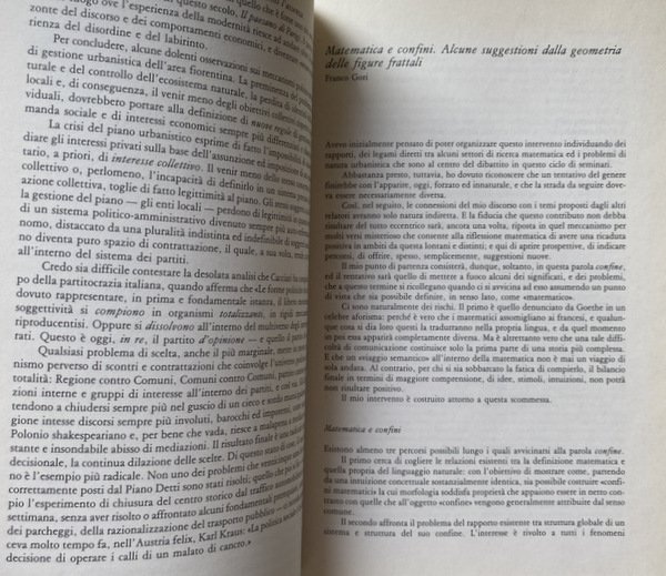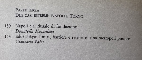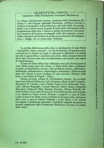 Soggetti: Architettura, Urbanistica, Geografia urbana, Tecnica e pianificazione urbanistica, Demografia, Densità, Barriere architettoniche, Studi culturali, Saggi, Critica, Metropoli, Megalopoli, Modernità, Spazio, Edilizia, Edifici, Limite, Territorio, Firenze, Toscana, Napoli, Tokyo, Giappone, Abitare, Abitazioni, Abitanti, Cittadinanza, Identità, Filosofia, Costruzione, Progettazione architettonica, Piano regolatore, Confini politici, Regolamenti, Sviluppo, Sistemazione urbanistica, Città, Criminalità, Confinamento, Periferie urbane, Slums, Scienze sociali, Sociologia, Comunità locali, Frontiere, Insediamenti abitativi, Politica, Villaggio, Globalizzazione, Casi-studio, Violenza, Dimensioni, Leggi, Cosmopoli, Emarginazione sociale, Alienazione, Borghi, Prato, Pistoia, Castello, Pistoiese, Recinti urbani, Quartieri, Estetica, Servizi, Ville, Limite, Études Diverses, Cities and towns, Italy, Growth, Case studies, Politische Grenzen, Siedlungsgrenzen, Siedlungskunde, Stadtgeografie, Stadtforschung, Stadtentwicklung, Stadtewesen, Ortsgemeinschaft, Örtlich Bedingte Gruppe, Stadtsoziologie, Staedtebauliche Entwicklung, Staedtebau, Political Boundaries, Frontieres Politiques, Settlement Boundaries, Frontieres Des Etablissements, Habitats, Urban Studies, Geography, Études Urbanistiques, Geographie, Development, Local Community, Spatially Determined Groups, Sociology Communautés Locales, Groupes Lies A Un Lieu, Sociologie Urbaine, Comprehensive Planning, Developpement, Urbanisme, Otis Duncan, Platone, Numero nuziale, Numero ideale, Max Weber, Fondiaria, FIAT, Relazioni, Borgate, Palermo, Venezia, Enti locali, Pubblica Amministrazione, Municipalità, Massimo Cacciari, Metropolis, Wallerstein, Capitalismo, Economia, Speculazione edilizia, Appalti, Gare, Materiali, Cemento, Inquinamento, Torino, Babilonia, Gerusalemme, Degrado, Argingrosso, Noebel, Campi Bisenzio, Fanelli, Edoardo Detti, Unwin, Roland Barthes, Sierpinski, Mandelbrot, Lorenz, Riferimento, Bibliografia, Consultazione, Libri Vintage Fuori catalogo, Curva di Koch, Geometria, Figure frattali, Donald J. Olsen, Edo, Jokamachi, Mario Miccio, Loris Rossi, Arredo urbano, Le Corbusier, Parigi, Vesuvio, Area vesuviana, Matilde Serao, Disordine, Lamont Young, Ottocento, Novecento, San Pietro a Patierno, Leonardo Benevolo, San Lorenzo, Neapolis, Sakariba, Tempo libero, Spirale d'acqua, Lucio Gambi, Sostenibilità, Povertà, Gecekondu, Baraccopoli, Banlieues, Paesaggio, Architecture, Urban planning, Urban geography, Technique and urban planning, Demography, Density, Architectural barriers, Cultural studies, Essays, Criticism, Metropolis, Megalopolis, Modernity, Space, Building, Buildings, Limit, Territory, Florence, Tuscany, Naples, Japan, Live, Dwellings, Inhabitants, Citizenship, Identity, Philosophy, Construction, Architectural design, Town planning, Political boundaries, Regulations, Development, Urban planning, Cities, Crime, Confinement, Urban suburbs, Social sciences, Sociology, Local communities, Borders, Settlements Housing, Politics, Village, Globalization, Case studies, Violence, Dimensions, Laws, Cosmopolis, Social marginalization, Alienation, Villages, Urban enclosures, Neighborhoods, Aesthetics, Services, Boundary, Plato, Nuptial number, Ideal number, Relations, Villages, Venice, Local Authorities, Public Administration, Municipality, Capitalism, Economy, Building speculation, Tenders, Materials, Pollution, Turin, Babylon, Jerusalem, Degradation, Reference, Bibliography, Consultation, Out of print books, Geometry, Fractal figures, Street furniture, Paris, Vesuvius, Vesuvius area, Disorder, Nineteenth century, Twentieth century, Leisure time, Water spiral, Sustainability, Poverty, Landscape