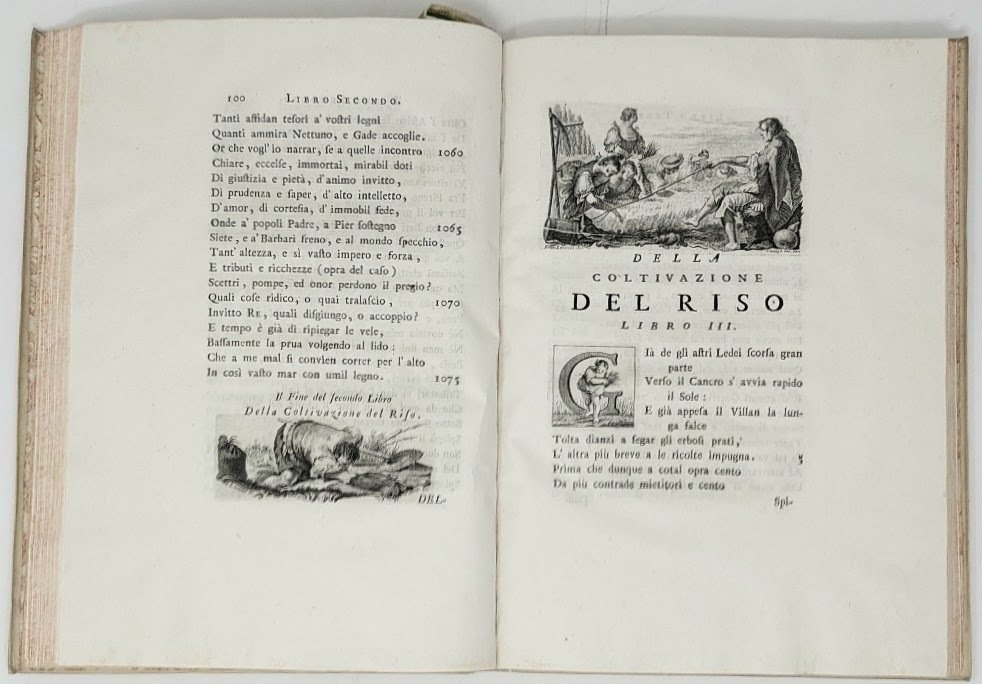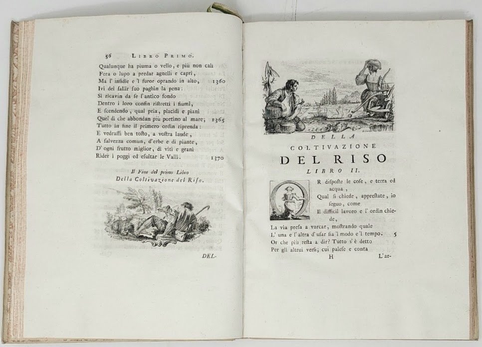 >in-4, pp. (10), 209, (1), leg. coeva p. perg. rigida, tass. in pelle con tit. oro al dorso. Seconda edizione, assai simile alla prima apparsa nel 1758. Finemente illustrata da una vignetta al tit., 5 capilettera istoriati, 4 grandi deliziose testate e finaletti. Noto poemetto in 4 canti in versi sciolti, per il quale l'autore scelse un argomento ancora inedito, fra i molti già trattati da didascalici veronesi, e che lo stesso Alamanni aveva escluso dalla sua «Coltivazione». Oltre la letteratura e la poesia, riguarda la gastronomia. Pur non essendo edito a Venezia, l'edizione è ampiamente descritta da Morazzoni a p. 172, come notevole esempio di tipografia veronese. Esemplare immacolato ed a grandi margini. Graesse VI, 472, note. B.IN.G., n. 1854, note. (Gamba 2452, Razzolini p. 324, Brunet V, 498 e Lanckoronska n. 232, tutti per la I ediz.).