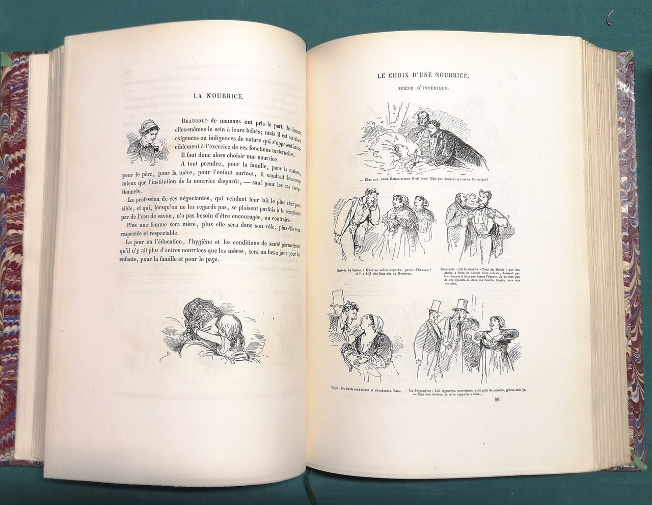 >in-4, pp. 651, (1), antiporta figurato, centinaia di graziose vignette in nero n.t. e tavole a piena pagina; magnifica legatura d'amatore in m. marocchino bruno, titolo e fregi in oro su dorso a nervi. Seconda edizione, contemporanea alla prima, di questo curioso ed esaustivo studio sulla moda, gli usi e i costumi dell'epoca, magnificamente illustrati dagli schizzi, spesso ironici, di Bertall. Perfetto esemplare.