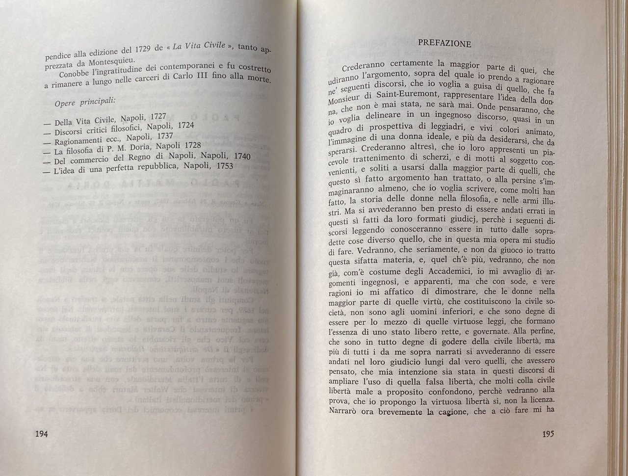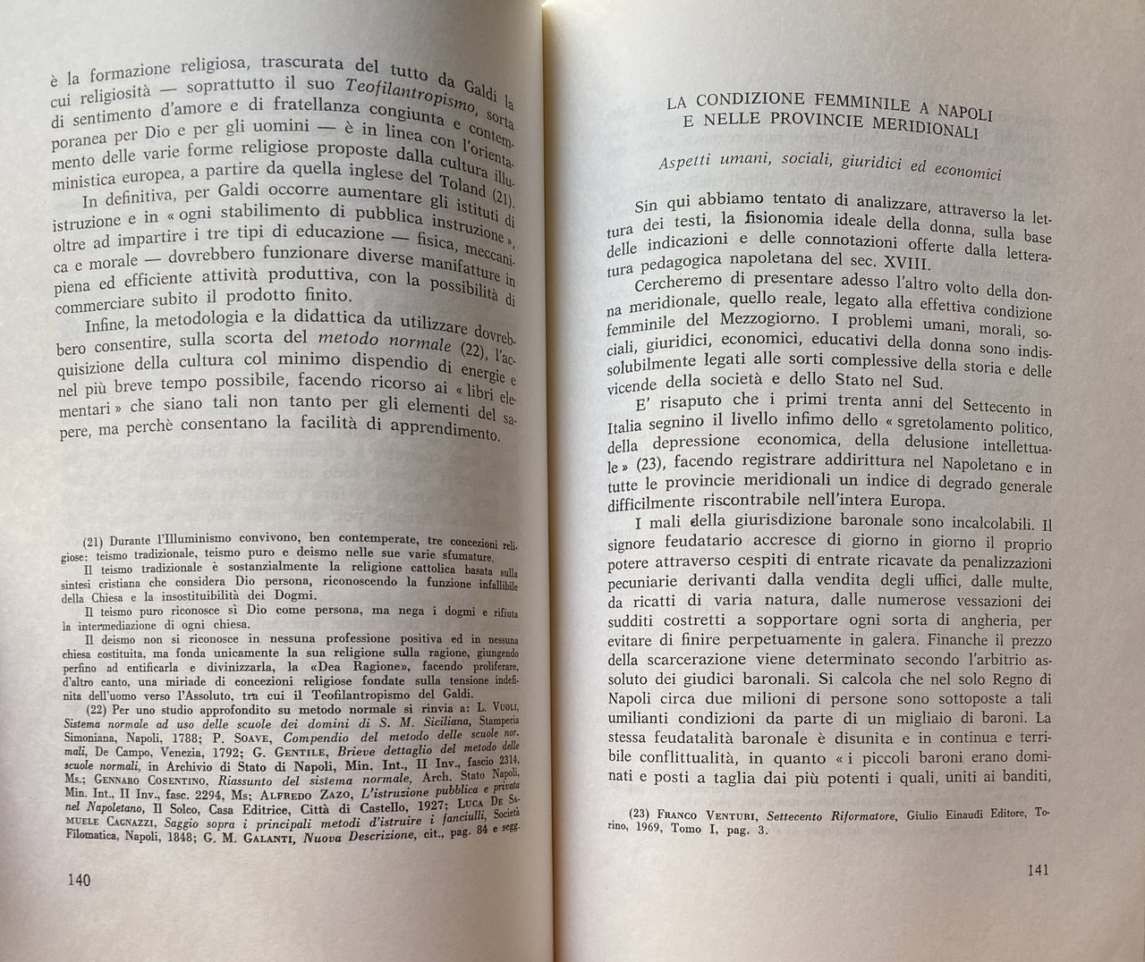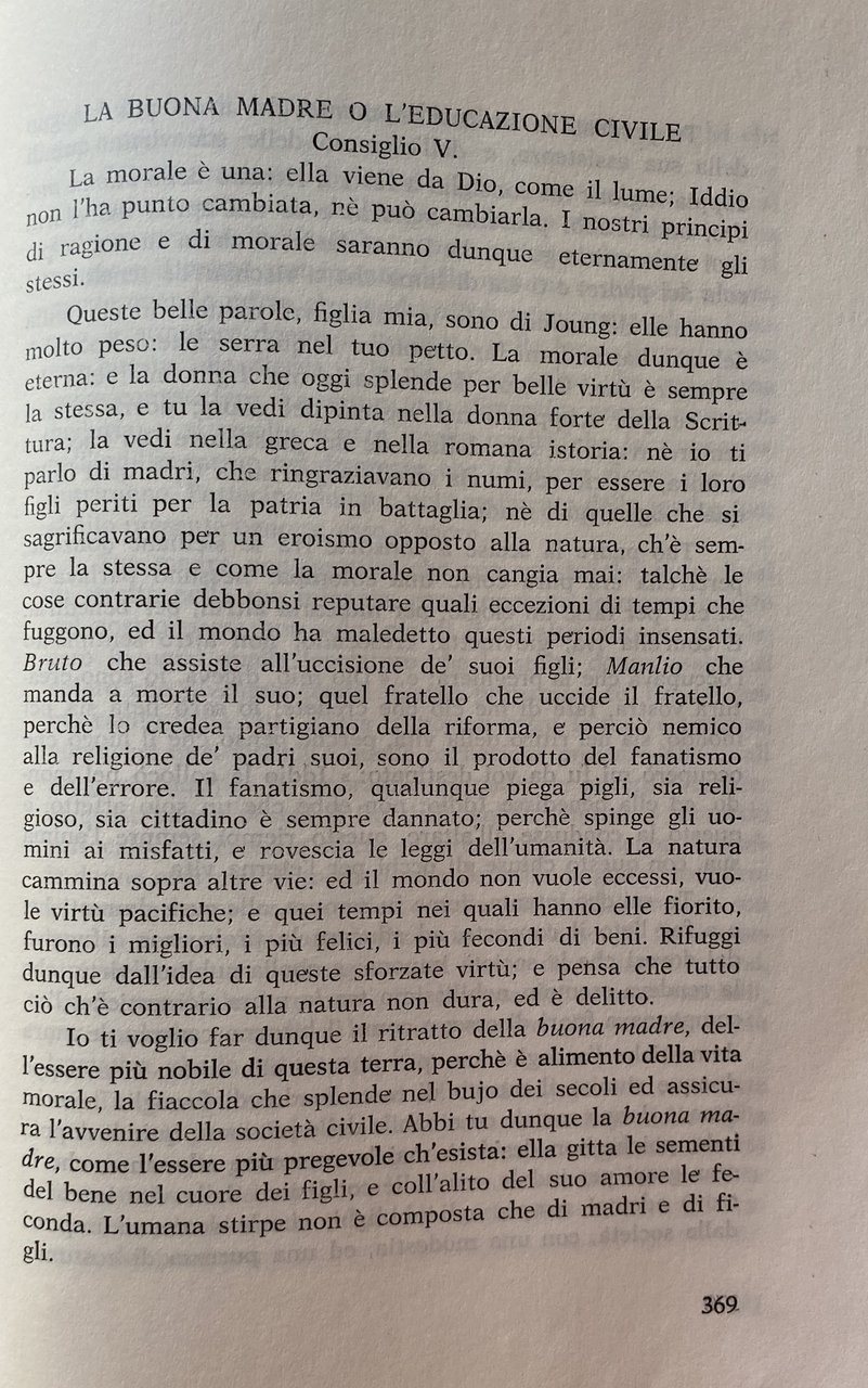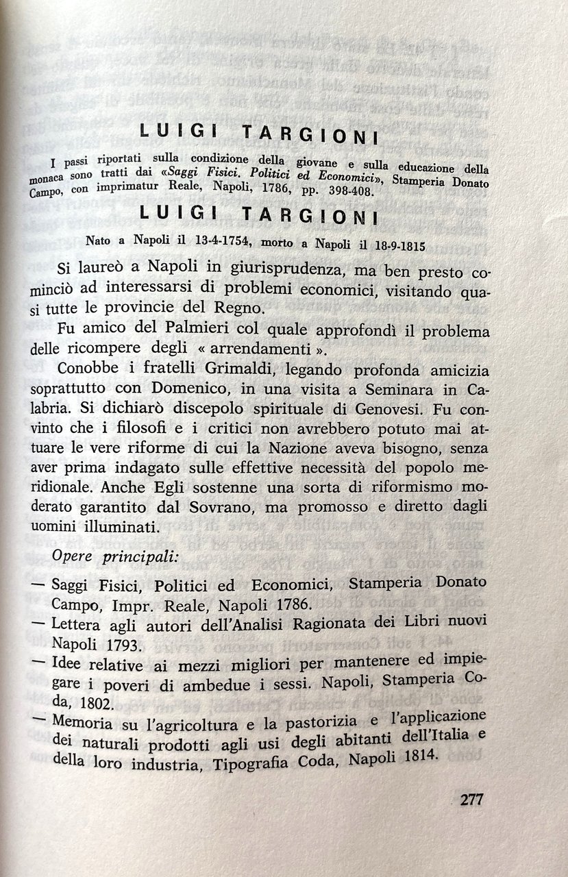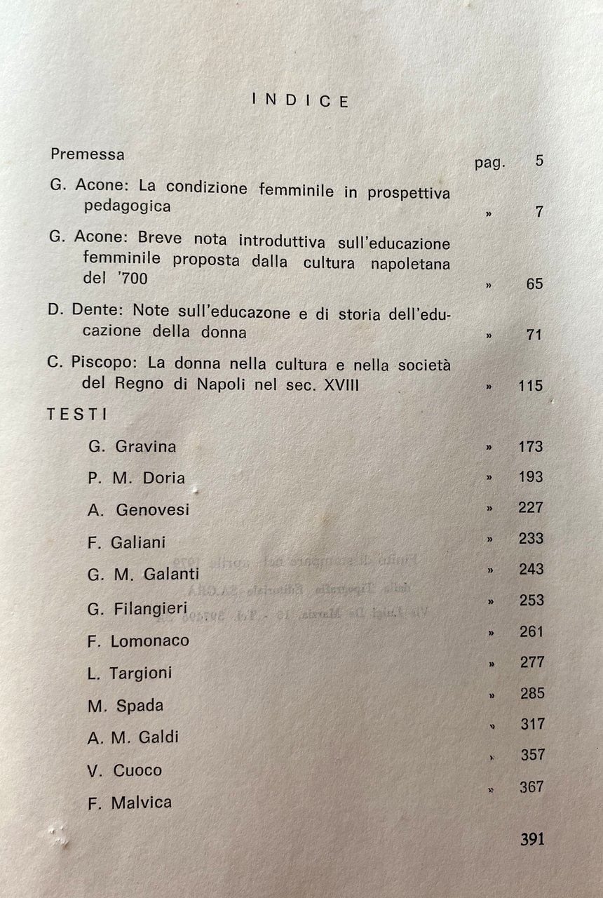 Soggetti: Condizione femminile Donne Storia di genere Pedagogia Educazione Formazione Settecento Letteratura Movimenti politico-culturali femministi Femminismo Cultura Marx Ideologia tedesca Divisione del lavoro Ruoli Sessualità Uomini Relazioni John Stuart Mill Soggezione Natura femminile Condizionamenti Psicologia Il secondo sesso Simone de Beauvoir Helene Deutsch Juliet Mitchell Shulamith Firestone Psicanalisi Reich Freud Marxismo Famiglia patriarcale Patriarcato Sessismo Discriminazioni Donna Madre Casalinga Focolare Preda Piacere Merce Sposa fedele Matrimonio Pudore Women's Liberation Movement Anni sessanta Lotta Emancipazione femminista Filosofia Oppressione Dominio Maschio Femmina Liberazione Razzismo Inferiorità Oppressione Potere Kate Millet Biologia Violenza Laing Fourier Radical Manifesto Bebel Engels Frau Sozialismus Differenza Jacques Monod Evelyne Sullerot Cromosoma Y Fisiologia Fenomenologia Tesi Libri rari fuori catalogo Saggi Vintage Collezionismo Bibliografia Riferimento Scritti Testi Teorie Sociologia Corpo Madri Maternità Aborto Figli Odette Thibault Genetica Ragazze Merville G.M. Galanti De Brosses Costumi sociali Comportamento Lazzaroni Nobiltà Aristocrazia Regno di Napoli Popolane Cortigiane Cesare De Seta Studi culturali Bouviere Laffargue Giovanni Carafa Illuminismo Istruzione Mezzogiorno Sud Italia Europa Misoginia Antonio Genovesi Gaetano Filangieri Diritto Lomonaco Debolezza Luoghi comuni Mentalità Difetti Scienze morali Morale Ferdinando Malvica Ottocento Consigli a mia figlia Monache Luigi Targioni Subordinazione Erasmo da Rotterdam Colloquia Familiaria Carattere Leon Battista Alberti Vives Castiglioni Bruni Verginità Rinascimento Legislazione scolastica Nobildonne Pieroni Bortolotti Capezzuoli-Cappabianca Olympe de Gouges Rivoluzione francese Dichiarazione Rose Lacombe Parità Camilla Ravera Teresa Labriola Cristianesimo Chiesa Istitutori Castità Eredità Beni Gestione Conventi Pietro Colletta Rosario Romeo Franco Venturi Giuseppe Galasso Sirri Gerini Alfredo Zazo Scuola pubblica Luca de Samuele Cagnazzi Storia contemporanea Differenze sessuali e di genere Problematicismo pedagogico Fanciulle Libri introvabili Saggistica Gian Vincenzo Gravina Paolo Mattia Doria Ferdinando Galiani Michelangelo Spada Galdi Vincenzo Cuoco Codice Ferdinandino Isabella Santacroce Felicità Casa Analfabetismo Eleonora de Fonseca Pimentel Ignoranza Maritaggio Conservatorio Ritiri spirituali Istituzioni Antonio Illibato Bernardo Tanucci Storia sociale religiosa napoletana moderna Istituti Educande Borbone Scuole femminili Prostituzione Seminario Donzelle Badessa Ferdinando IV Ragazze povere Reale Albergo Clausura D'Epinay Celibato Giovanni Fabbroni Amore coniugale Adulterio Stupro Successioni legittime Successione Eredità Montesquieu Female condition Women Gender history Pedagogy Education Training Eighteenth century Literature Feminist political-cultural movements Feminism Culture German ideology Division of labor Roles Sexuality Men Relationships Subjection Feminine nature Conditioning Psychology The second sex Psychoanalysis Psychology Patriarchal Patriarchy Sexism Discrimination Woman Mother Housewife Home Prey Pleasure Goods Bride Faithful Marriage Modesty The Sixties Fight Feminist Emancipation Philosophy Oppression Domination Male Female Liberation Racism Inferiority Oppression Power Biology Violence Difference Chromosome Physiology Thesis Rare books out of print Essays Collectibles Reference Writings Theories Sociology Body Mothers Abortion Children Genetics Girls Social customs Behavior Nobility Kingdom of Naples Commoners Courtesans Cultural studies Enlightenment Education Southern Italy Europe Misogyny Law Weakness Clichés Mentality Defects Moral sciences Nineteenth century Advice to my daughter Nuns Subordination Erasmus Character Virginity Renaissance School legislation Noblewomen French Revolution Declaration Equality Christianity Church Institutes Chastity Heritage Assets Management Convents Public school Contemporary history Sexual and gender differences Pedagogical Problematics Unavailable books Non-fiction Ferdinand Code Happiness Home Illiteracy Ignorance Marriage Conservatory Spiritual retreats Institutions Modern Neapolitan religious social history Institutes Bourbon boarders Schools Prostitution Seminary Damsels Abbess Ferdinand IV Poors Royal Hotel Enclosure Celibacy Marital love Adultery Rape Legitimate successions Succession Inheritance