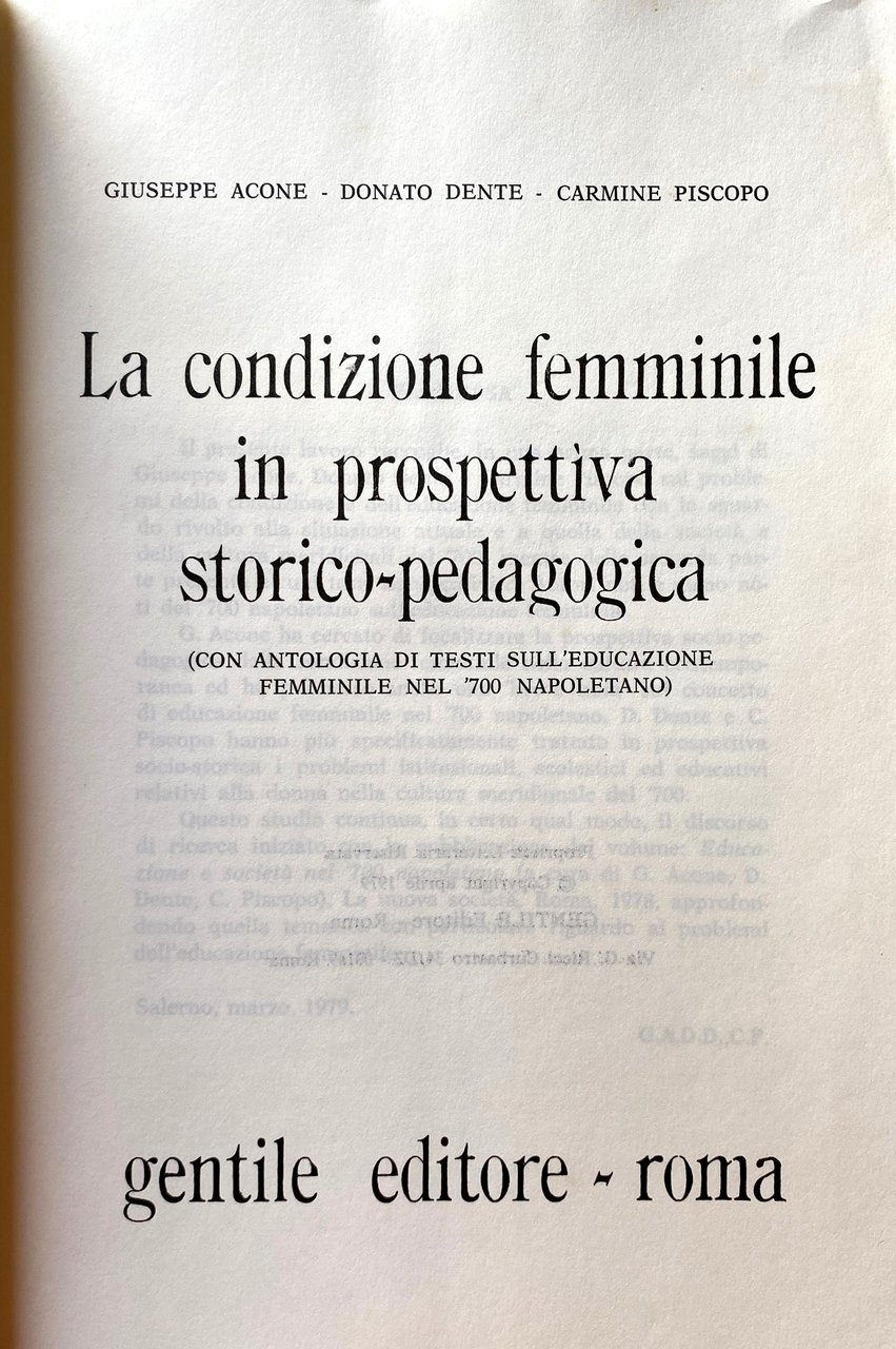 Il presente lavoro raccoglie, in una prima parte, saggi di Giuseppe Acone, Donato Dente e Carmine Piscopo sui problemi della condizione e dell'educazione femminile con lo sguardo rivolto alla situazione attuale e a quella della società e della cultura meridionali del '700: mentre della seconda parte presenta alcuni testi significativi di Autori noti e meno noti del '700 napoletano sull'educazione femminile. Acone ha cercato di focalizzare la prospettiva socio-pedagogica della condizione femminile nella cultura contemporanea ed ha premesso anche una breve nota sul concetto di educazione femminile nel '700 napoletano. Dente e Piscopo hanno più specificatamente trattato in prospettiva socio-storica i problemi istituzionali, scolastici ed educativi relativi alla donna nella cultura meridionale del '700. Questo studio continua, in certo qual modo, il discorso di ricerca iniziato con la pubblicazione del volume: Educazione e società nel '700 napoletano, approfondendo quella tematica con particolare riguardo ai problemi dell'educazione femminile.
