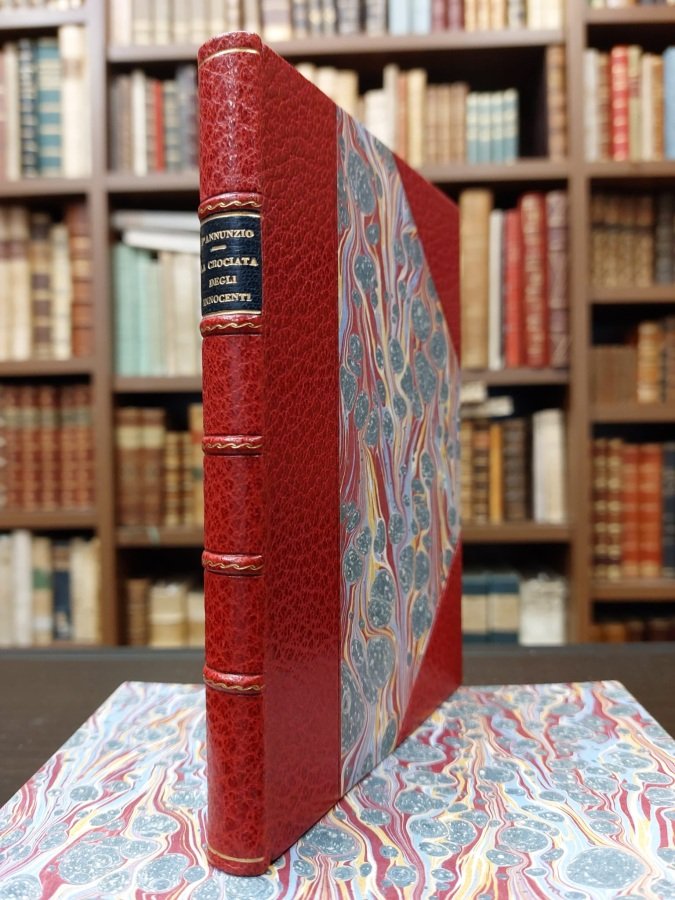 <span style="font-style: normal;">In-16° (cm. 17,2), graziosissima legatura d'amatore in mezza pelle magenta zigrinata ad angoli, dorso a nervi con titolo in oro su tassello blu e fregi in oro, taglio superiore dorato, piatti marmorizzati, risguardi in azzurro; conservata la brossura originale illustrata in verde con titolo in nero; pp. 86 [10] su carta forte grigia, in barbe, in ottimo stato (</span><i>Ex libris</i> applicato al risguardo, un altro impresso al margine del frontespizio). Titolo silografico e 12 disegni xilografici a tinta verde, di cui 4 a piena pagina, nonché fregi xilografici in verde nel testo, il tutto disegnato e inciso da E. Mantelli. Edizione parzialmente originale, poiché propone il testo uscito su «L'Eroica» nel 1915 con alcuni inediti, proposta da Ettore Cozzani nella collana «I Gioielli de L'Eroica» nn. 11-12. Cfr. Gambetti-Vezzosi 255; Guabelli 183. Superbo esemplare conservato in custodia cartonata con la stessa marmorizzatura dei piatti. (NX)