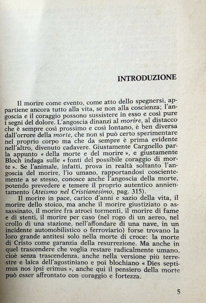 Il morire come evento, come atto dello spegnersi, appartiene ancora tutto alla vita, se non alla coscienza; l'angoscia e il coraggio possono sussistere in esso e così pure i segni del dolore. L'angoscia dinanzi al morire, al distacco che è sempre così prossimo e così lontano, è ben diversa dall'orrore della morte, che non si può certo sperimentare nel proprio corpo ma che da sempre è prima evidente nell'altro, divenuto cadavere. Giustamente Cargnello parla appunto della morte e del morire, e giustamente Bloch indaga sulle fonti del possibile coraggio di morte. Se l'animale, infatti, prova in realtà soltanto l'angoscia del morire, l'io umano, rapportandosi coscientemente a se stesso, conosce anche l'angoscia della morte, potendo prevedere e temere il proprio autentico annientamento (Ateismo nel Cristianesimo).