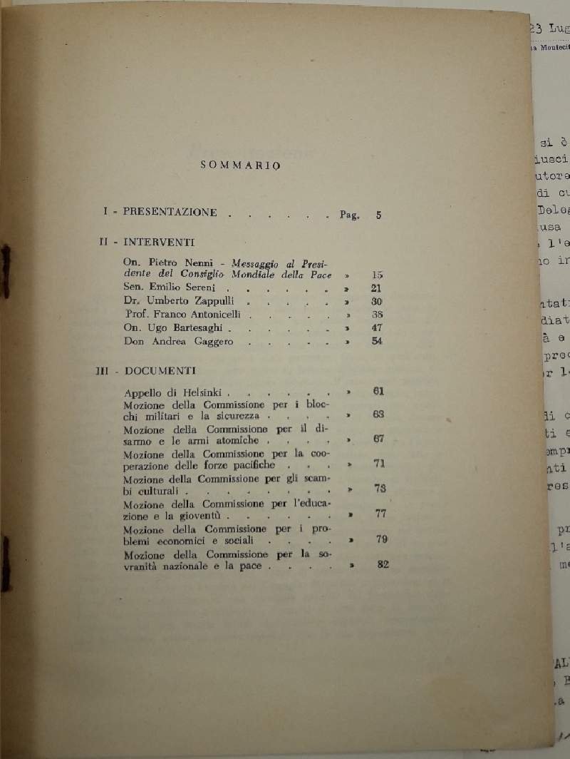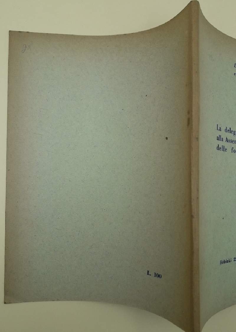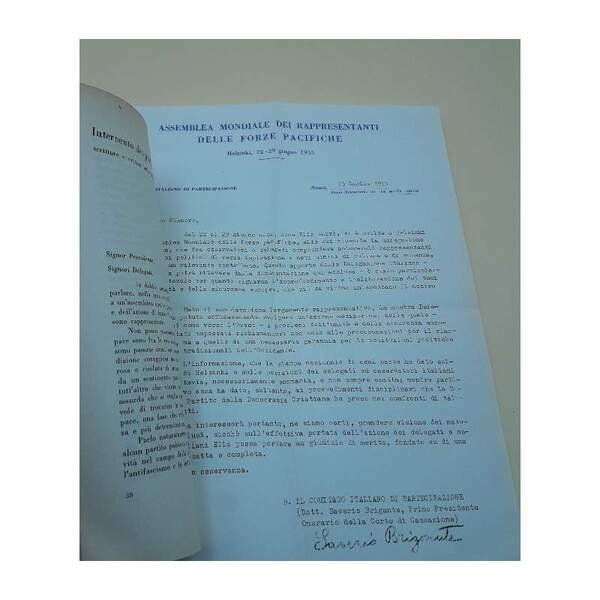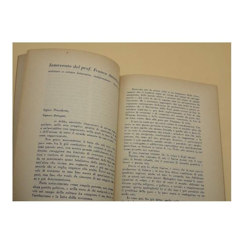 In 8', br. ed. pp. 85, La costruzione dell'Europa e il disarmo atomico e generale, Helsinki 22-29 giugno 1955; conservata all'inerno lettera di presentazione del Comitato Italiano di partecipazione alla Assemblea Mondiale delle Forze Pacifiche (foto). Bruniture ai margini, punti di spillo arrugginiti, interno in buono stato, segni del tempo. ***Due to bureaucratic reasons, books dated over 70 years old cannot be immediately exported, please contact us before placing the order.***