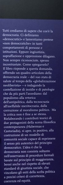 Tutti crediamo di sapere che cos'è la democrazia. Ci definiamo «democratici» e lamentiamo pretese «non democratiche» in tanti comportamenti di persone e istituzioni. Eppure ingiustizia, sopraffazione e oppressione dilagano. Non sempre riconosciute, spesso incontrastate. Come mai? Il libro risponde a questa domanda, offrendo un quadro articolato della democrazia reale – del suo stato di salute al tempo della «globalizzazione neoliberista» – e indagando la costellazione di insidie e di patologie che da più parti l’assediano: dal populismo alla retorica dell’antipolitica, dalla tecnocrazia all'ineffabile meritocrazia, dalla corruzione al moralismo politico. Ma la critica non è fine a se stessa. Rielaborando i contributi teorici di due protagonisti della scena filosofica contemporanea (Habermas e Castoriadis), si apre, in positivo, alla costruzione di un modello di comunità sociale capace di esprimere il senso più autentico del principio democratico. L’idea è che la democrazia non consista soltanto nell'osservanza di procedure formali basate sul principio di maggioranza, bensì anche nel rispetto di elevati standard di giustizia sociale, che vincolino gli esiti della scelta politica a precisi criteri di correttezza, coerenza ed equità. Prende così forma una teoria radicale della democrazia. Nella quale l’esercizio dell’autorità coincide essenzialmente con la pratica dell’autonomia collettiva; il corpo sociale definisce in concreto regole della convivenza compatibili con i princìpi di libertà ed eguaglianza; e la funzione del diritto non consiste tanto nell'organizzare la forza, quanto nel porre limiti invalicabili alla violenza.