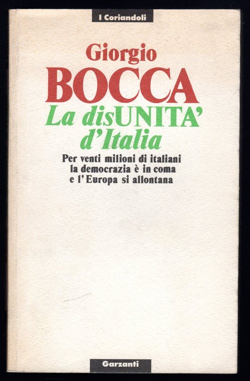 Libro vintage. Argomento: Saggi. Autore: Bocca Giorgio. Editore: Garzanti. Luogo: Milano. Anno: 1990. Formato: in-16°. Pagg: 112. Legatura: Brossura con bandelle. Collana: I Coriandoli. Conservazione: ottima. Dalla bandella: "Il 1990 è l'anno della disunità d'Italia".