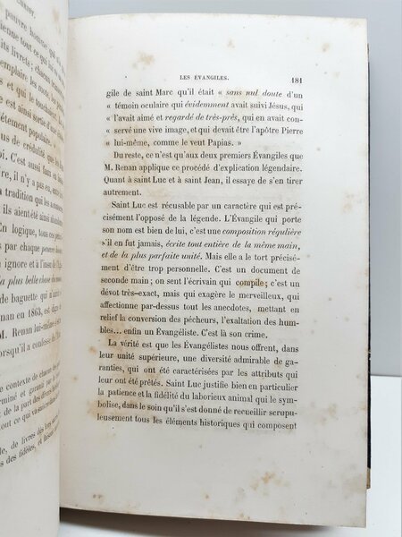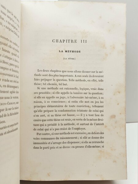 legatura rigida in mezza pelle con dorso in pelle con titoli e fregi in oro, segni del tempo, angoli leggermente consumati, dorso con etichetta di catalogazione e segni del tempo, tagli spruzzati impolverati e ossidati, alla seconda di copertina ex libris, interno in condizioni accettabili, frontespizio e antiporta ossidato con fioriture diffuse presenti anche alle pagine interne, in francese, numero pagine 458 dimensioni cm 22 x 15