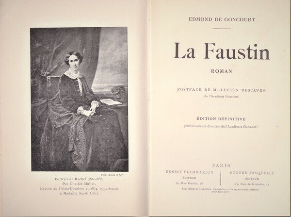 In-16 gr. (mm. 189x129), brossura originale, pp. 282,(2), con una tavola fotografica al frontespizio che raffigura Elisabeth Félix - meglio nota come Mademoiselle Rachel - celebre attrice teatrale francese (1820-58), qui ritratta dal pittore Charles Muller. "La Faustin", stampato nel 1882, evoca infatti il mondo del teatro che aveva sempre affascinato lo scrittore Edmond Huot de Goncourt (1822-1896), a cui si deve anche la fondazione della società letteraria Goncourt nel 1876, ufficialmente costituita nel 1902.Presso Edmond, al secondo piano della sua casa di Auteuil, ch'egli chiamava granaio, si riuniva ogni domenica un piccolo cenacolo di amici. Fu in questo granaio che prese corpo l'idea di fondare l'Accademia, composta di dieci membri i quali sono incaricati di assegnare ogni anno un premio a un'opera narrativa che si distingua per la giovinezza, l'originalità del talento, la novità e l'ardimento del pensiero e della forma.. Il premio Goncourt è il più antico e ambito premio letterario francese (fra i prermiati figurano Proust, Malraux, Simon de Beauvoir). Così Enciclopedia Larousse (Rizzoli),VII, p. 279.Rarissima edizione numerata di 35 esemplari sur papier de Hollande. Il ns. - 31 - è un esemplare intonso, a fogli di due diverse larghezze; solo due pagine con alone al margine interno, altrimenti, molto ben conservato.