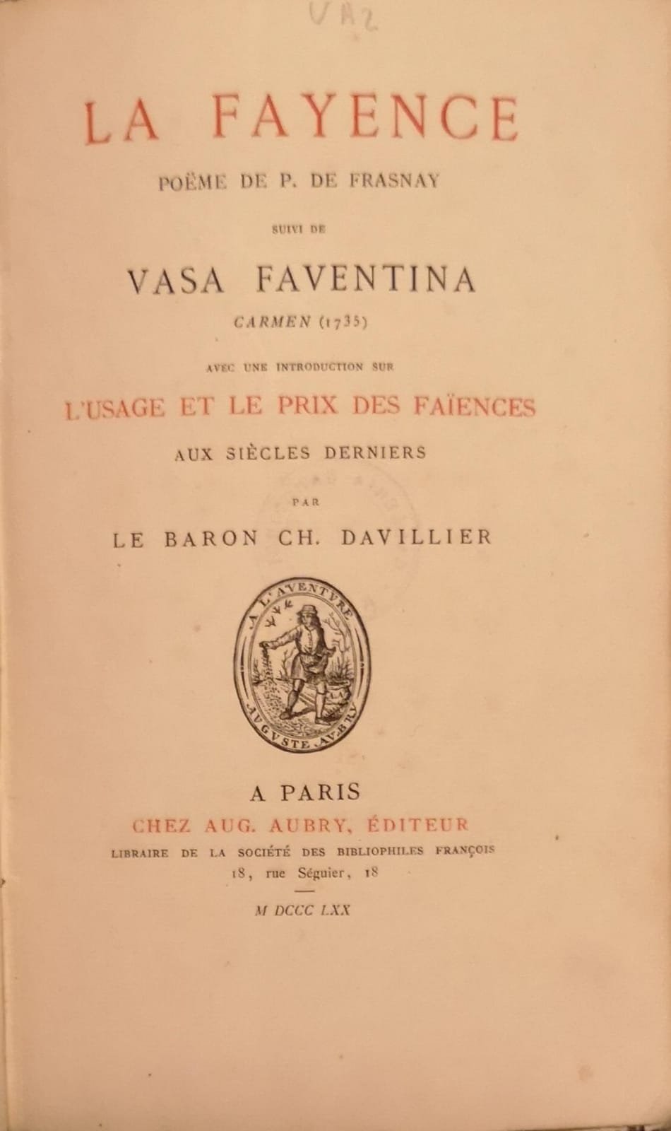 LA FAYENCE. - Suivi de Vasa Faventina, Carmen (1735), avec un introduction sur l'usage et le prix des faiences...