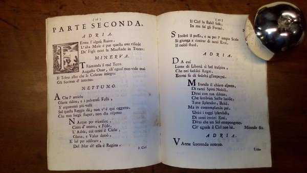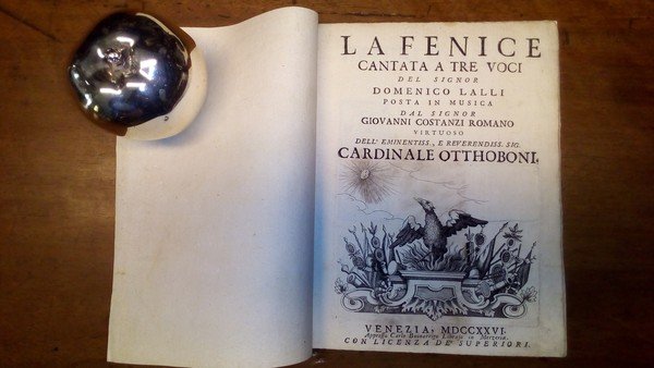 in-8, pp. 24, leg. mod. carta marmorizzata. Gr. vignetta in rame al front. raff. la fenice. Capilett. e fregi xilogr. Picc. vignetta in rame al fine con i simboli dell’Arcadia. Operetta del noto violoncellista e letterato romano (1704-1778) che sostituì il Corelli come maestro musicista al servizio del Cardinale Ottoboni, cui è anche dedicata quest’opera. Ediz. orig. Fetis II, p. 372.
