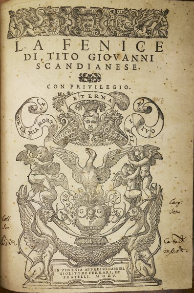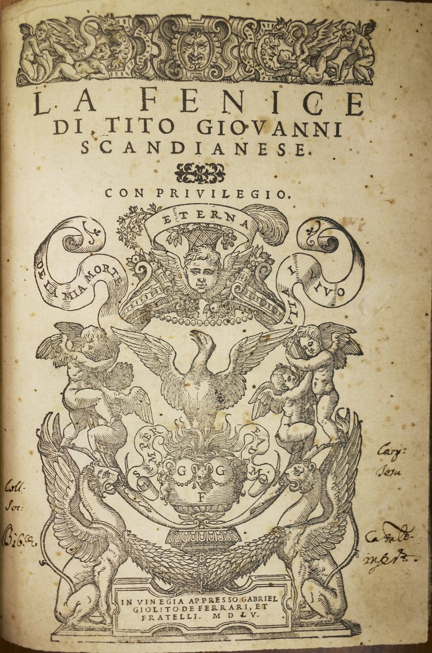 In-16 gr. (mm. 193x135), mz. pelle moderna, piatti in cartonato ottocentesco, pp. 79, grande marca tipografica al frontespizio e, più piccola, in fine; ornato da grandi e belle iniziali figurate a vignetta, testatine, fregi e finalini, tutto inc. su legno. Rara "prima edizione", dedicata dall'A. a Pietro Ancarani.Difatto in questo libretto, oltre a esservi tradotto ciò che si legge presso gli antichi sul famoso uccello, sono alquante moderne composizioni sullo stesso soggetto, le quali hanno per fine di esaltare, mediante allusione all'impresa, il Giolito e la sua stampa, non che la sua figliuola egualmente detta Fenice nata da poco tempo, ma che già mostrava forse segni di bellezza e di gentilezza. Così Bongi,I,p. 477. Ultima carta con angolo restaur. e con antiche postille a penna al verso, lievi aloni, peraltro ben conservato.