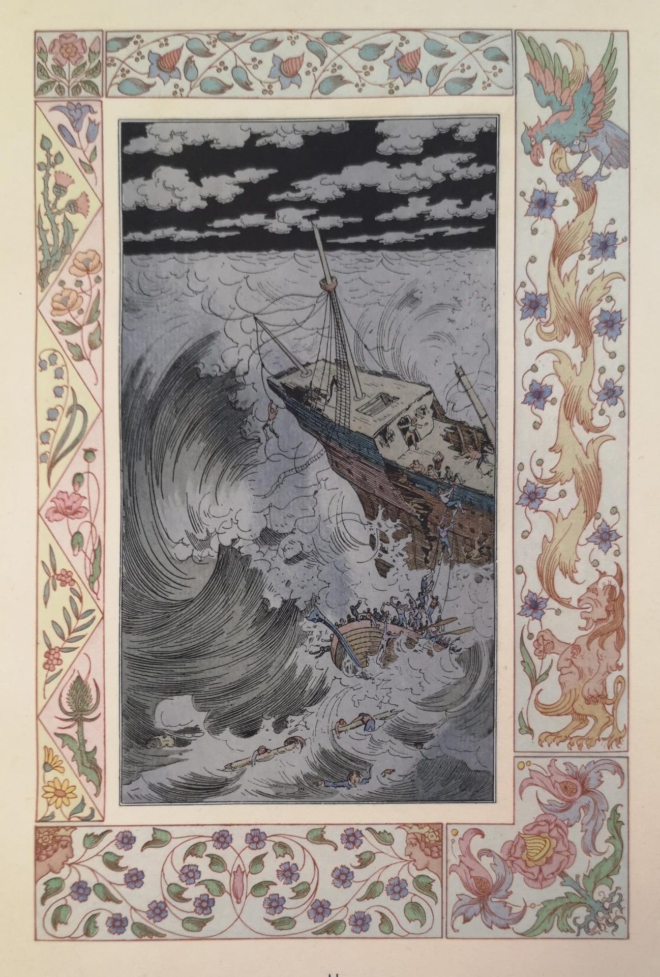 In-8 gr. (mm. 264x195), cartonato Varese, titolo oro su tassello al dorso, conservata brossura editoriale a colori, pp. 53, testo entro delicata cornice a colori, ornato dalle graziose illustrazioni e miniature a colori realizzate da Léon Lebègue. Sono presenti 42 suite in bianco e nero fuori testo. Edizione originale. Dedica autografa dellartista a Joseph Uzanne (fratello di Octave Uzanne).Léon G. Lebègue (1863-1944), è allievo a Parigi di J.L. Gérome. Membro della Société des Artistes français, al cui Salon espone dal 1907, ottenendo una menzione donore nel 1909. Illustra vari libri che incontrano il favore dei bibliofili (così Diz. illustratori simbolisti e Art Nouveau, p. 11).Bella edizione darte in tiratura limitata di 189 esemplari numerati. Il ns., ad personam (exemplaire de collaborateur) appartiene alla tiratura sur papier vergé à la forme, des papeteries dArches, avec tirage en noir, sur papier de Chine, de toutes les illustrations, molto ben conservato.