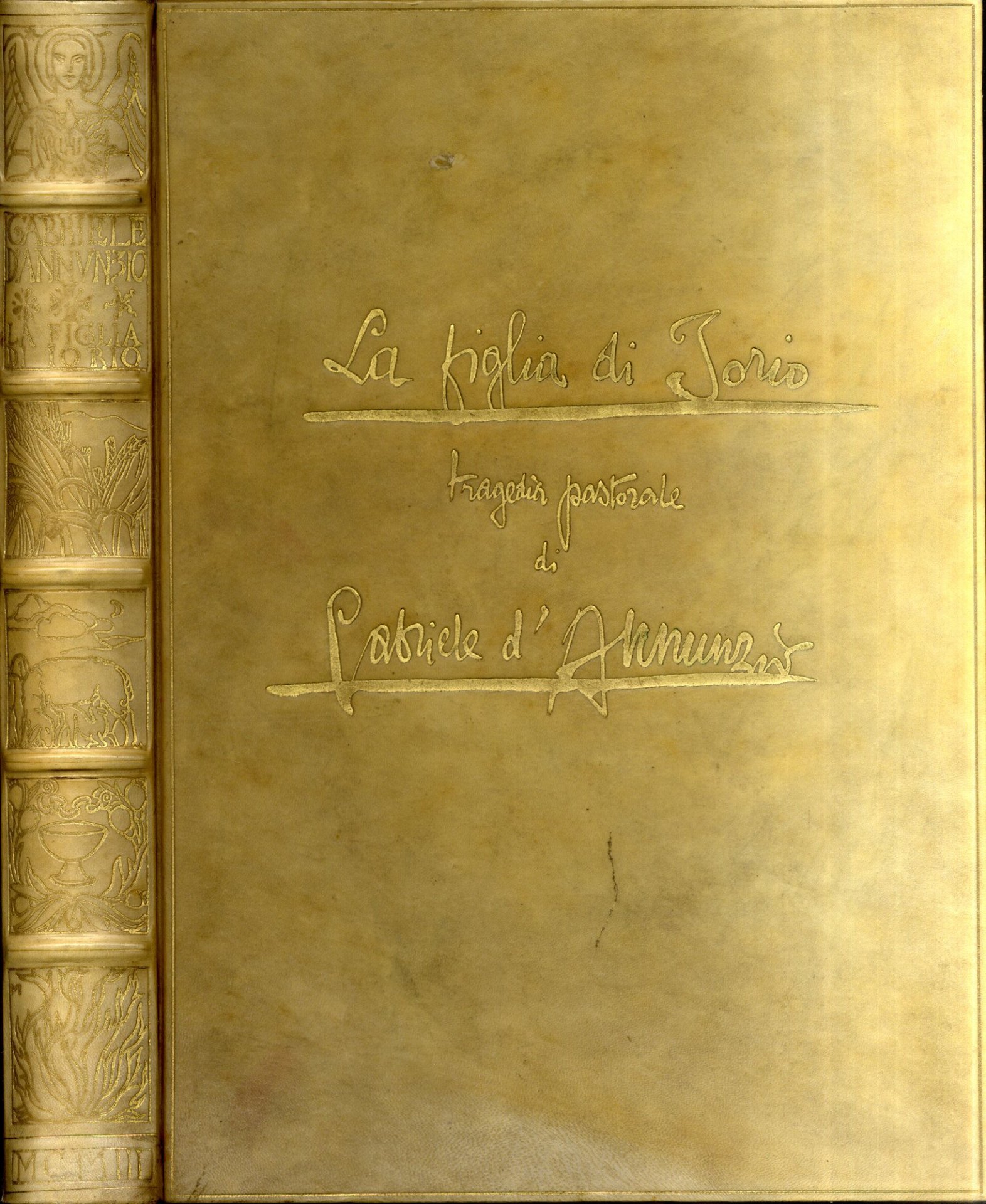 >in-folio, ff. 204, (2) di tavole in facsimile in rosso e nero e pagine a stampa; leg. editoriale in p. pergamena, titolo e filetti in oro al piatto ant. dorso a 5 nervi magnificamente impresso con figurine religiose e pastorali sempre in oro, sguardie in seta color salvia ricamate in oro con motivi a fiamma, tagli sup. e inf. dorati. Astuccio in cart. rigido decorato. Sontuosa edizione, stampata su carta forte in 750 esemplari, nell'anno della morte di D'Annunzio. L'opera riproduce in facsimile la prima stesura autografa della tragedia, con testo a stampa dell'edizione Treves a fronte. Questa ''tragedia pastorale'' in versi, tra le più celebri di Gabriele D'Annunzio (1863 - 1938) fu rappresentata la prima volta al Teatro Lirico di Milano nel 1904. Esemplare n° 168 perfetto, in barbe. Guabello n. 170; Vecchioni n. 30; Falqui p. 29.